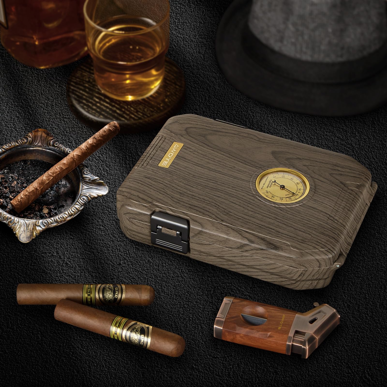 【High-end Travel Cigar Humidor】The travel cigar humidor is made of ABS material, which is waterproof and drop-proof, and the surface shows wood texture, which adds a touch of classical flavor to this stylish item. Cigar humidor measures 9.6*6.8*2.3inch and can hold 7-9 cigars. Portable cigar humidor is compact in size and fits in your luggage, allowing you to enjoy your cigars while traveling.This cigar humidor is inlaid with a hygrometer on the top, which makes it easy for you to check the humidity inside the cigar case at any time and take appropriate measures in time