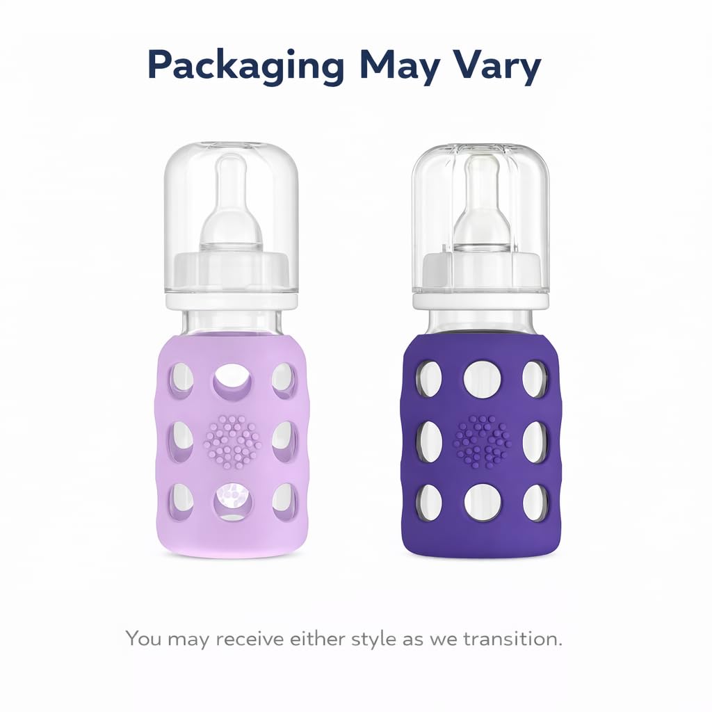 The perfect starter bottle for baby. The Lifefactory 4oz glass baby bottle comes with a silicone sleeve, polypropylene cap, ring, and stopper, and a Stage 1 (0-3 months) silicone nipple. These are wonderfully easy to clean: the bottle stays inside the silicone sleeve, and go right in the dishwasher. As baby grows the Lifefactory 9 oz glass baby bottle is the next step up. With a variety of nipple sizes and sippy caps our bottle adapts to your baby's changing needs. The 9 oz. bottle comes with a silicone sleeve, polypropylene cap, ring, stopper, and a Stage 2 (3-6 months) silicone nipple. You'll appreciate the grippy surface of the colorful silicone sleeve, and you'll love the fact that you're using a glass bottle that is manufactured with high quality materials.