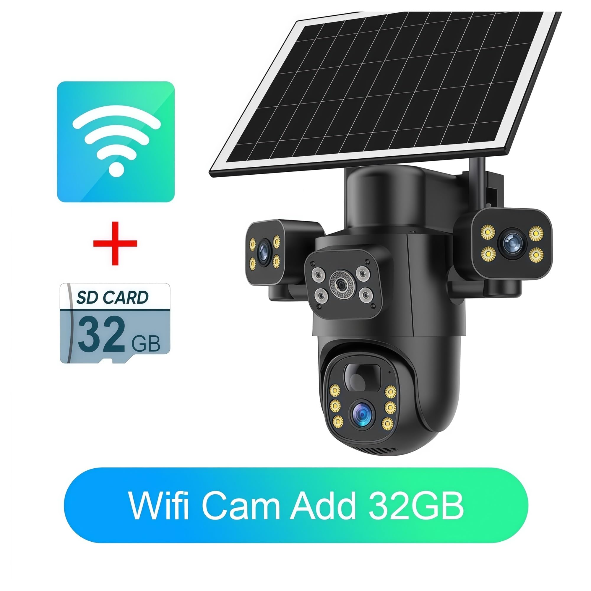 Solar Camera|Solar Camera Review|Three-Lens PTZ Control:Features 3 lenses for 360° coverage & 10X digital zoom, with manual PTZ adjustments for versatile surveillance.