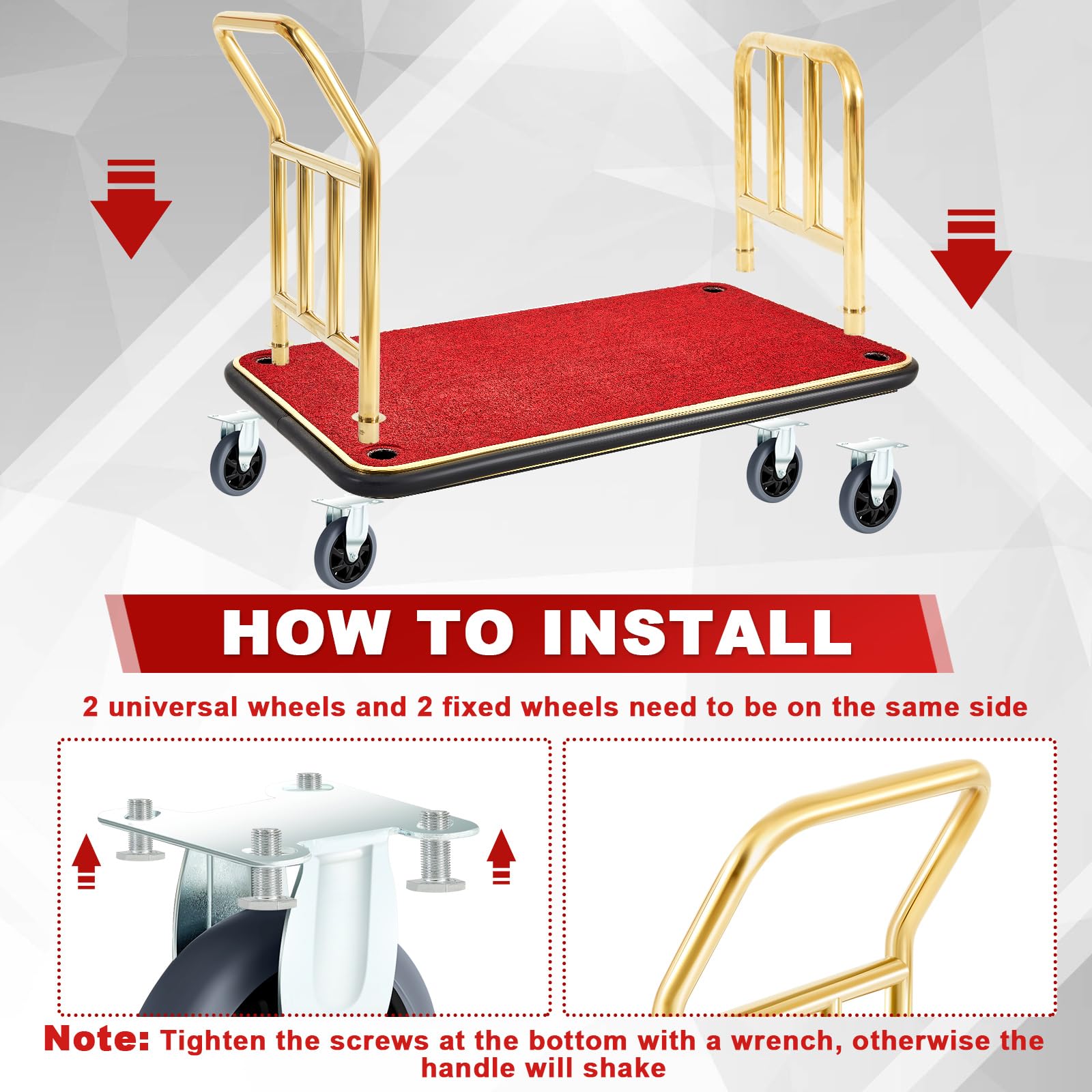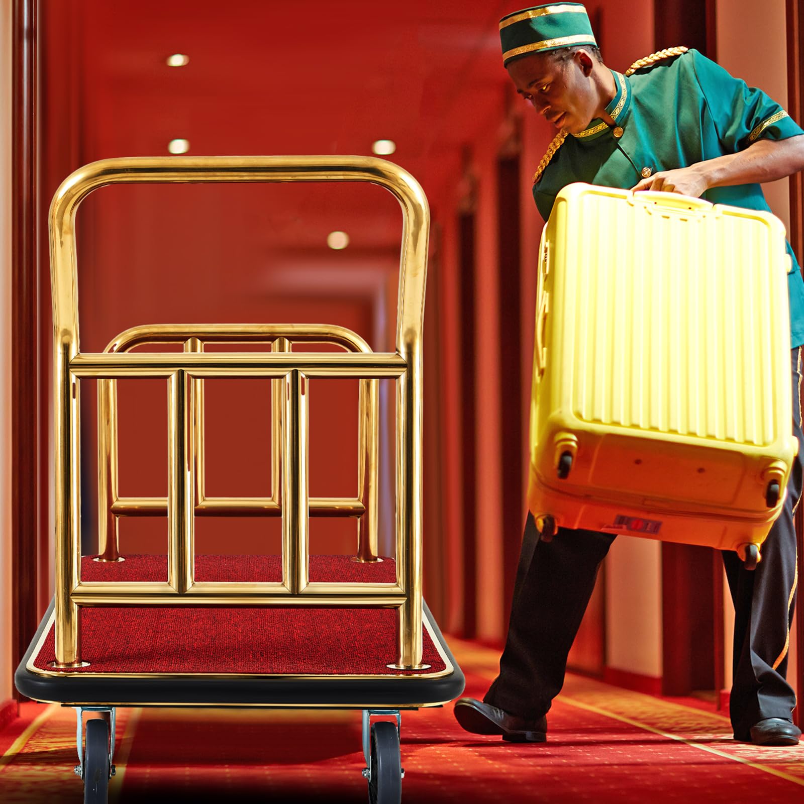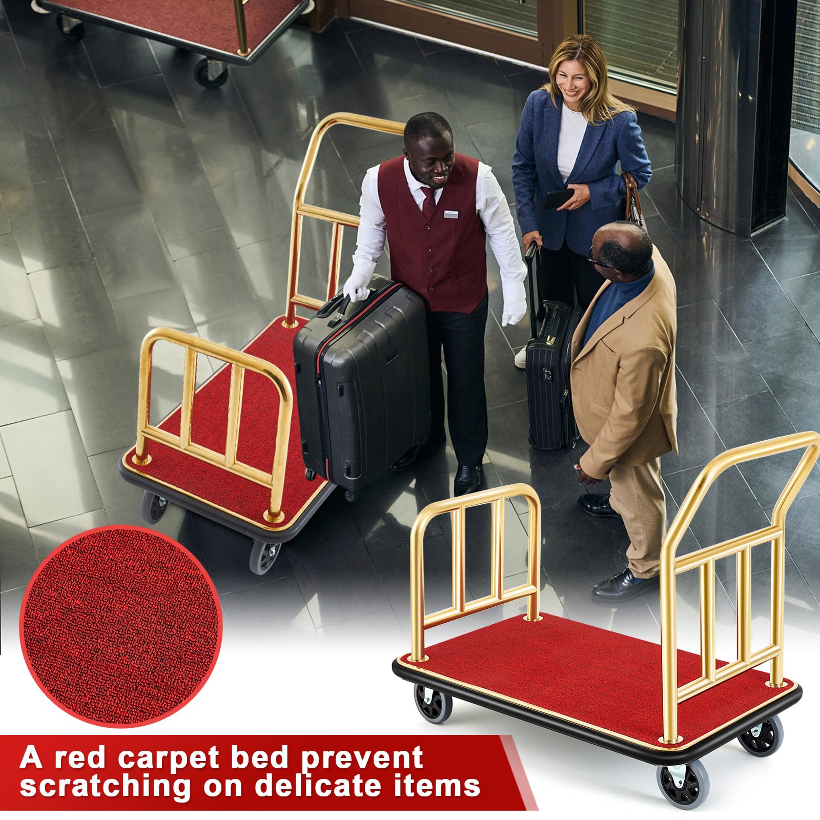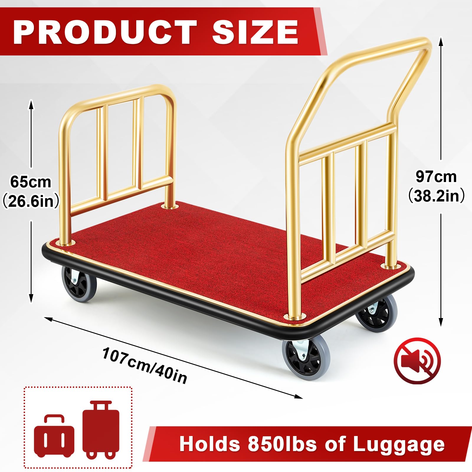 Suitable Dimensions: measuring 107 x 65 x 97 cm/40 x 26.6 x 38.2 inches, this platform truck is furnished with gold handles and a red carpet bed; Fits impeccably in offices, hotels, and other commercial settings