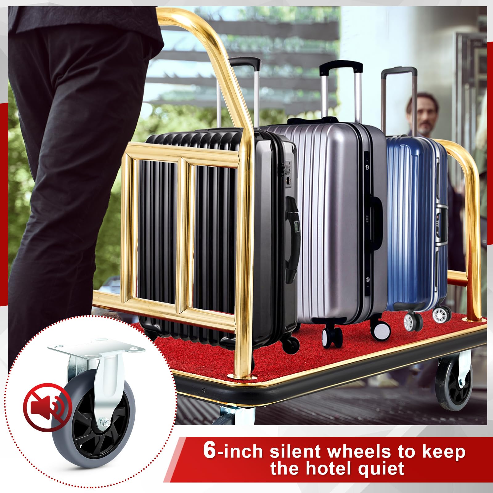 6 Inches Wheels: featuring 2 orienting wheels and 2 universal wheels, the hotel luggage cart offers nice mobility; Its 6 inch noise-reducing wheels prevent scratching on delicate items such as luggage or suitcases, ensuring a convenient and smooth movement