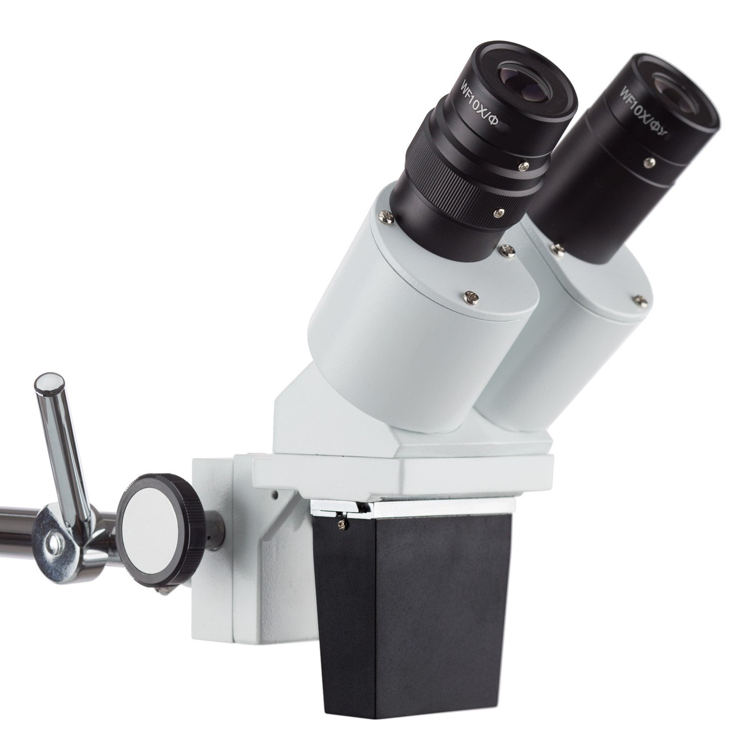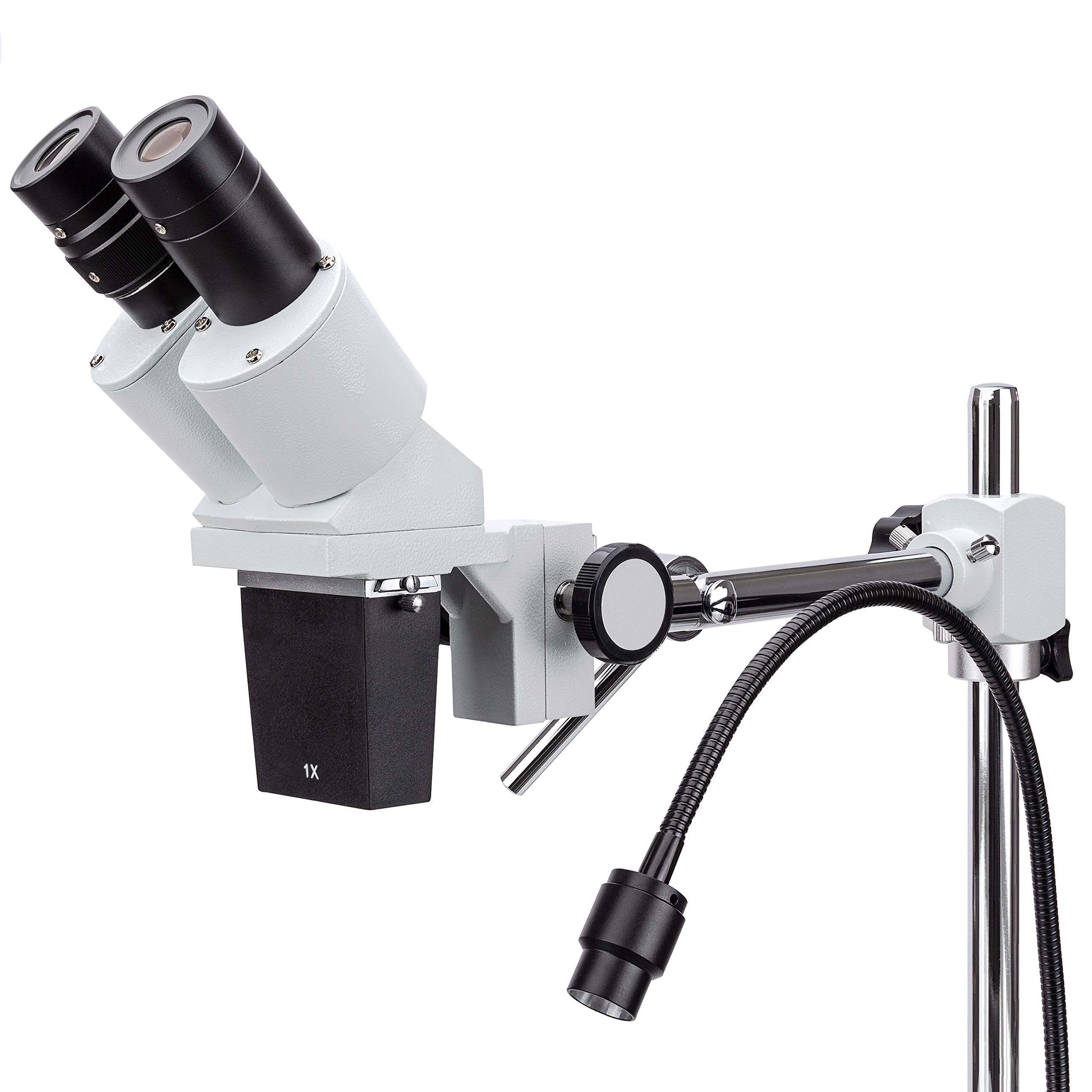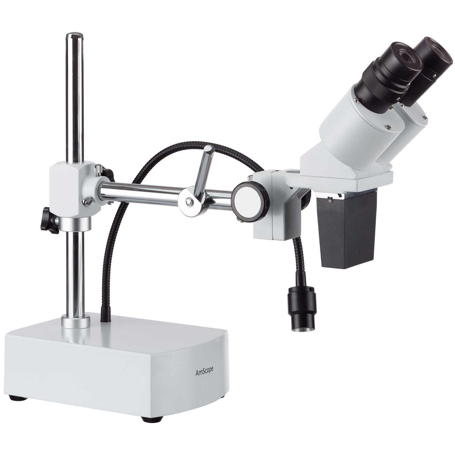 The AmScope SE400X professional stereo microscope has interchangeable pairs of 5x and 10x widefield eyepieces, a 1x objective, LED lighting, and a boom-arm stand. The binocular viewing head has an interpupillary range of 50 to 77mm and a 30-degree inclination to reduce eye and neck strain. The interchangeable pairs of WF5x18mm and WF10x18mm eyepieces combine with the 1x objective to provide 5x and 10x magnification, and a longer working distance for inspecting large-scale specimens that require handling or repair. Dioptric adjustment accommodates individual eye-strength differences. A stereo microscope, sometimes called an inspection or dissection microscope, has low magnification and a long working distance that enables users to manipulate the object being inspected. The 1W LED light is mounted on a flexible gooseneck to enable users to direct the light as needed. An LED light source provides bright, cool light for working with temperature-sensitive specimens. The microscope has a 13.5" pillar that provides a 9" vertical working distance. Bilateral focus eases use for left- and right-handed users. The 17" boom arm has a 12" working distance. The microscope head can be rotated on the X- and Y-axes. All metal construction is durable and stain-resistant. SpecificationsHeadBinocularMagnification5x, 10xObjective power 1xEyepieces (DIN, 30.5mm)WF5x18mm, WF10x18mmFocusBilateral coarseMicroscope standBoom-arm standVertical working distance9" (13.5" overall pillar length)Boom arm12" working distance (17" overall length)Head rotationX- and Y-axesIllumination typeUpper, reflectedLight source1W LED on adjustable gooseneckPower110V-120V, UL listed Microscopes are instruments used to enhance the resolution of an object or image. Types include compound, stereo, or digital. Compound microscopes use a compound optical system with an objective lens and an eyepiece. Stereo microscopes show object depth in a three-dimensional image. Digital microscopes are used to display an image on a monitor, rather than looking through a lens. Microscopes can have monocular (one), binocular (two), or trinocular (three) eyepieces, with varying magnification abilities. Magnification ability refers to the size of an image. Resolution, also known as resolvant power, refers to the clarity of the image. The interaction between field of view (FOV), numerical aperture (NA), and working distance (WD) determines resolution. Microscopes can control magnification through a fixed focus, or through a range of adjustments. They can also utilize LED, fluorescent, and mirror light sources to help control viewing capabilities. Microscopes are widely used in education, lab research, biology, metallurgy, engineering, chemistry, manufacturing, and in the medical, forensic science, and veterinary industries. United Scope manufactures microscopy equipment and accessories under the brand name AmScope. The company, founded in 1996, is headquartered in Irvine, CA. What's in the Box? AmScope SE400X stereo microscope with boom-arm stand WF5x18mm eyepieces, 30.5mm, one pair WF10x18mm eyepieces, 30.5mm, one pair 1x objective (2) Eye guards LED light Dust cover Power cord Instructions