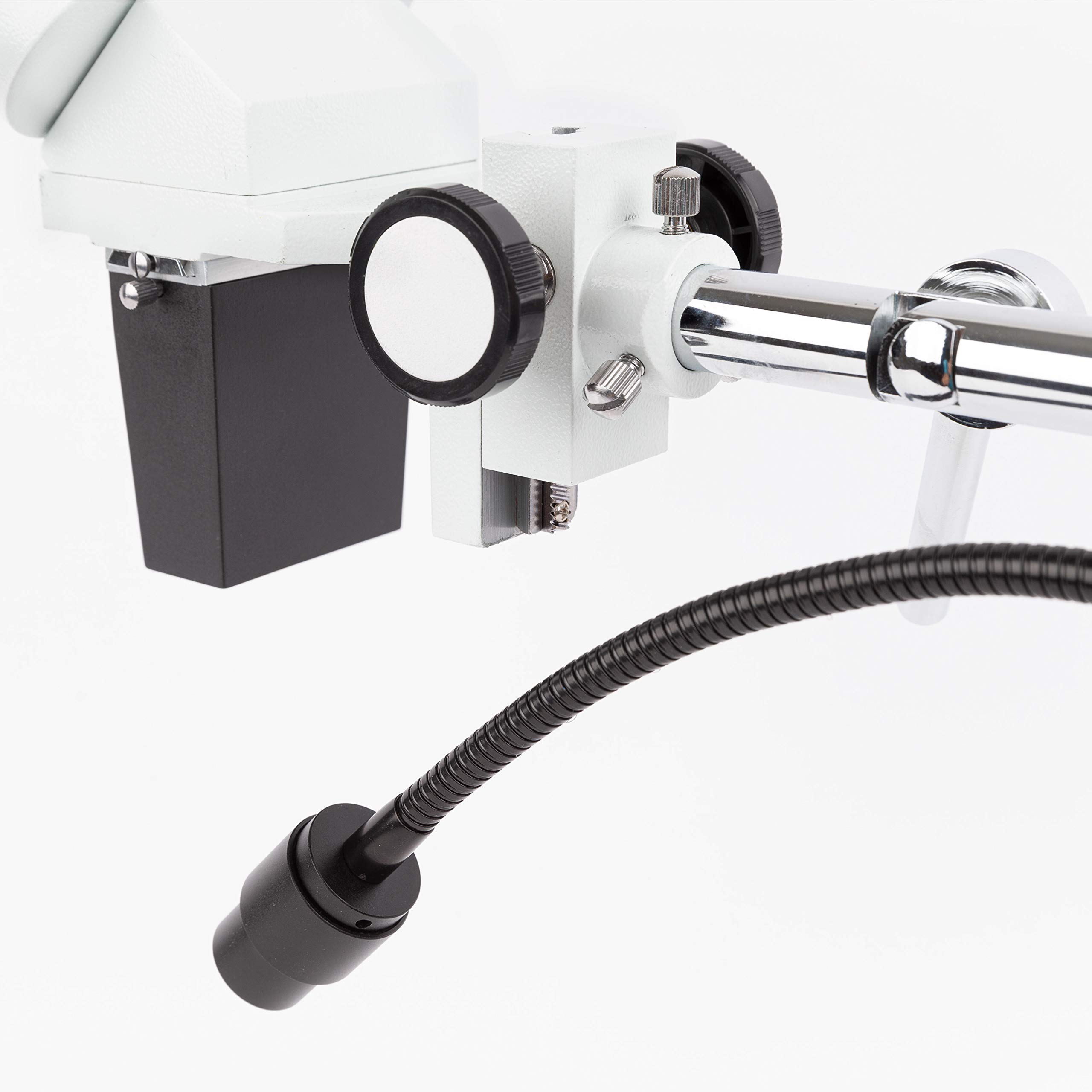 Professional stereo microscope with boom arm has long working distance to enables users to perform work or manipulate large items, including circuit boards and dental appliances