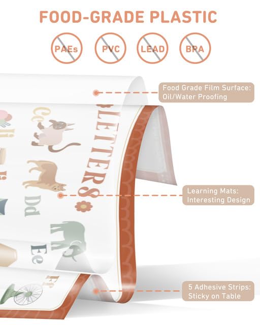 Food Grade Plastic: We put baby's health first, The placemats for kids are made of food-grade plastic, BPA, PVC, PHTHALATE and LEAD-free and other toxic substances. Toddlers can easily drop things on the table mat, without you having to worry about germs
