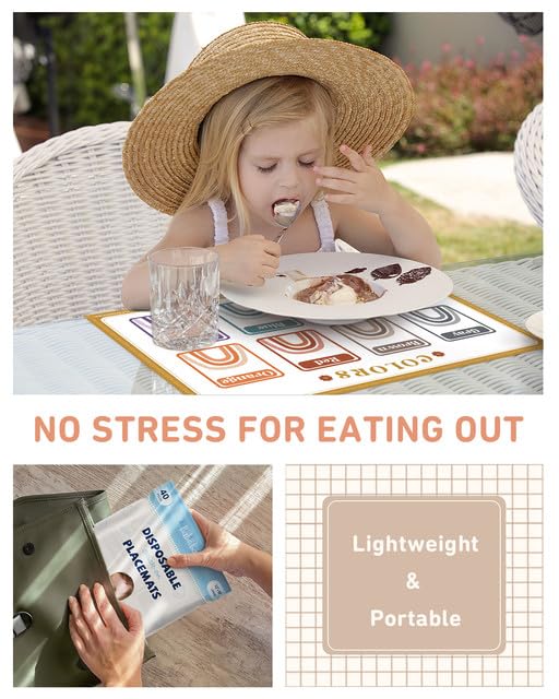 No Stress for Eating Out: Our disposable placemat keeps baby from dirt and provides a hygienic surface for eating and playing. Lightweight and portable, it is the perfect baby placemats for restaurants, outdoors, travel, home, high chairs