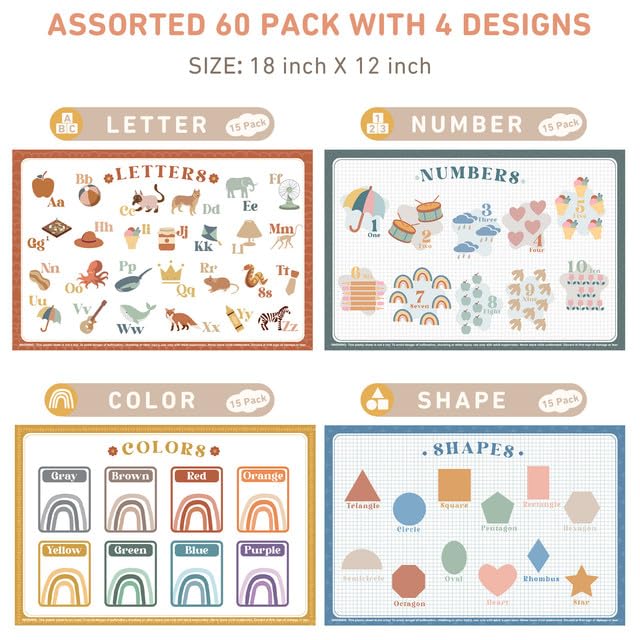 Fun and Educational Design: 60 packs of kid's placemats with 4 different pattern designs, about letters, numbers, colors, shapes. See how baby enjoys mealtime or playtime with these fun designs and learn about alphabets