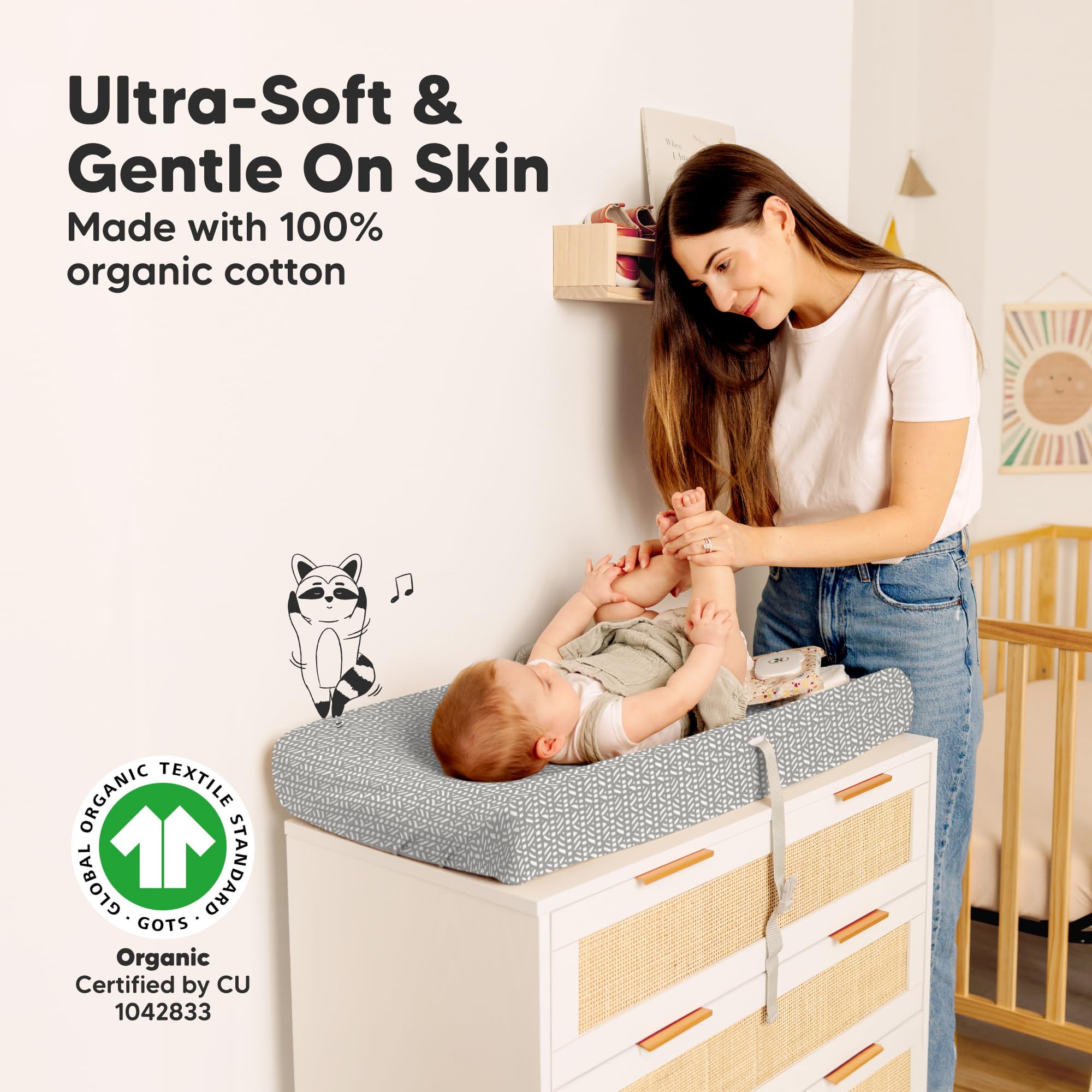 Ultra Softness - Made from 100% organic cotton (GOTS-Certified CU 1042833), our Soothe Changing Pad Covers are softer than muslin, more breathable, & gentle on baby’s skin, providing a soothing experience on the changing table during diaper changes.