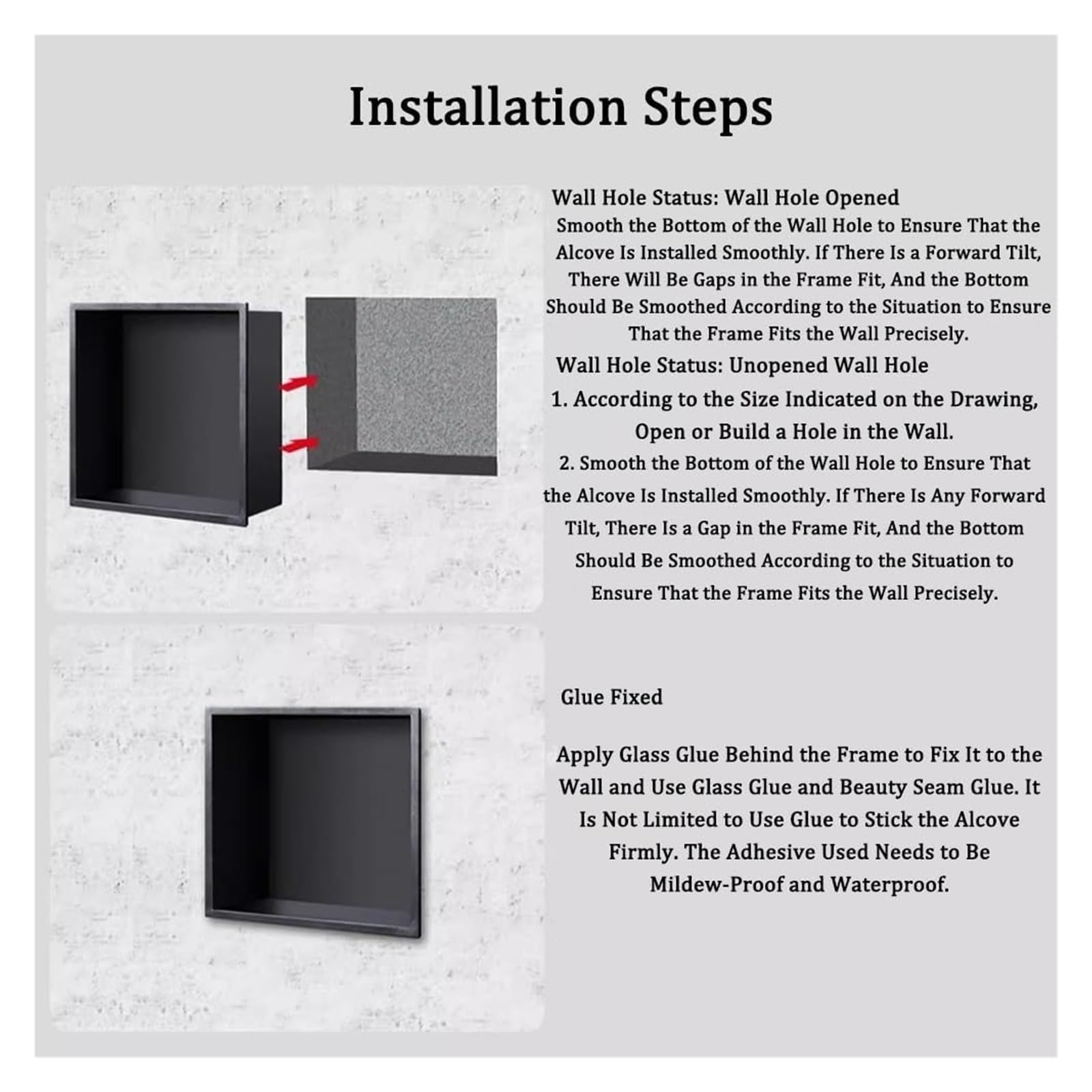 ✔️ Features: 1. Our shower niche is your daily shower holder that doesn't take up floor space, provides extra storage space for your bathroom essentials and keeps your bathroom tidy. 2. The shower room is made of stainless steel, which is waterproof and rust-proof, smooth and easy to clean, not easy to rust, sturdy and durable, and very suitable for wet rooms such as bathrooms. 3. Easy to install, use foam strips and tile glue to fix the recessed gap, no additional mounting tools are required ✔️ Specifications: Name: Shower Niche/Bathroom Shelves/Shower Organizer/Wall Shelf Material: Stainless steel. Color:Gray,Black,Gold Size: 20x52x13.5cm, 20x63x13.5cm Function: Storage Occasions: Fit the scene: home/hallway/bedroom/entryway/cloakroom/office/bedroom/balcony/hotel/study room/laundry room/supermarket/retail/boutique ✔️Package List: 1 x Stainless Steel Shower Niche