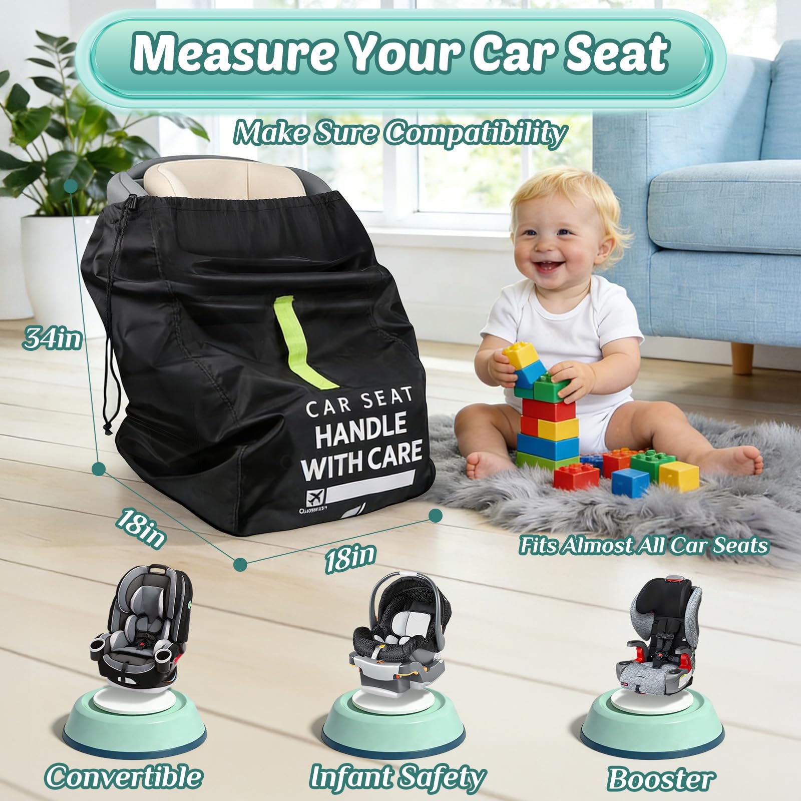 Wide Compatibility: This car seat travel bag for airplane comes in a 34x18x18inch size which can easily accommodate almost all major brands of Infant carriers, booster seats, convertible car seats, fits for Doona/Graco/Evenflo/Maxi Cosi/Britax/Cybex/Chicco.