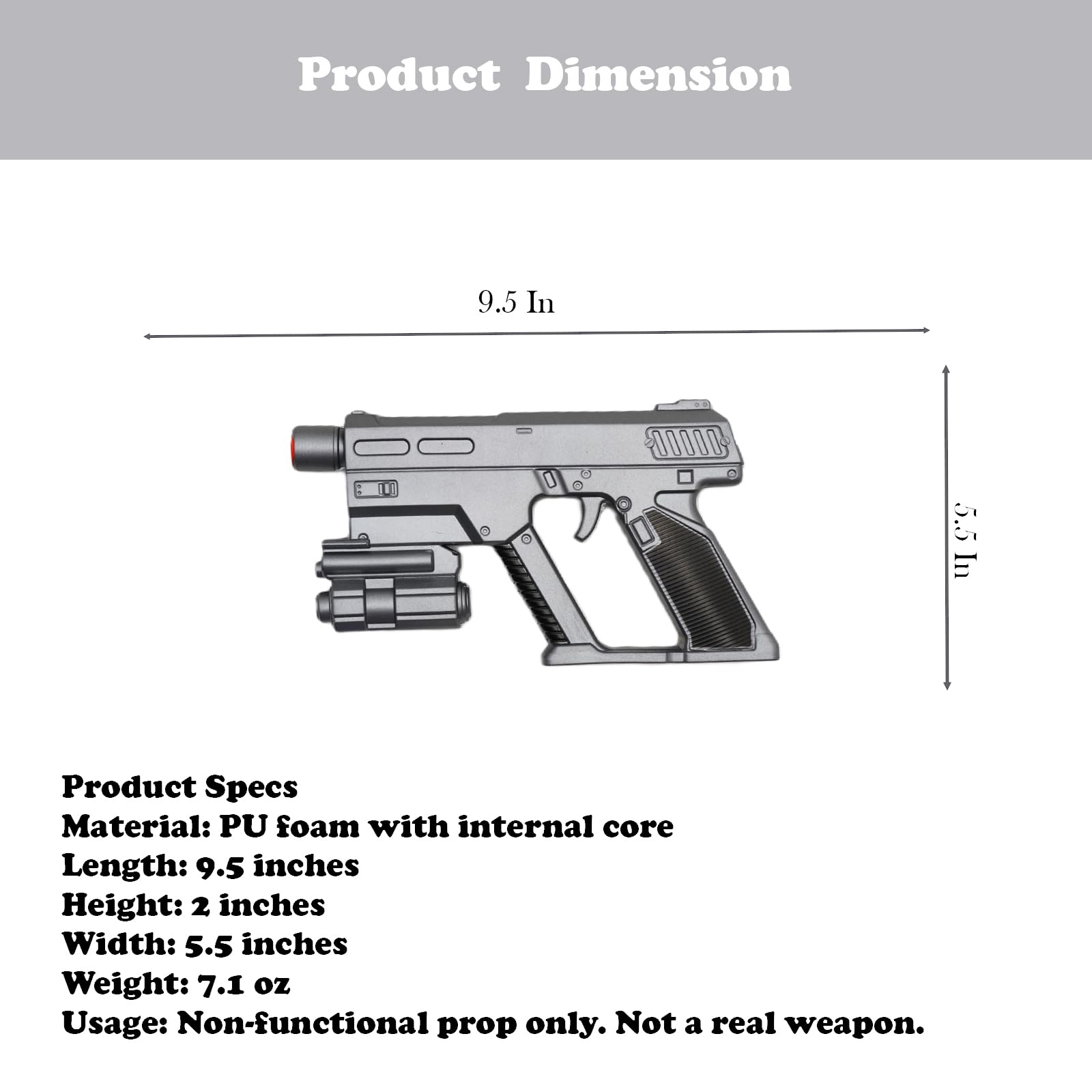 Product Specs Material: PU foam with internal core Length: 9.5 inches Height: 2 inches Width: 5.5 inches Weight: 7.1 oz Usage: Non-functional prop only. Not a real weapon.