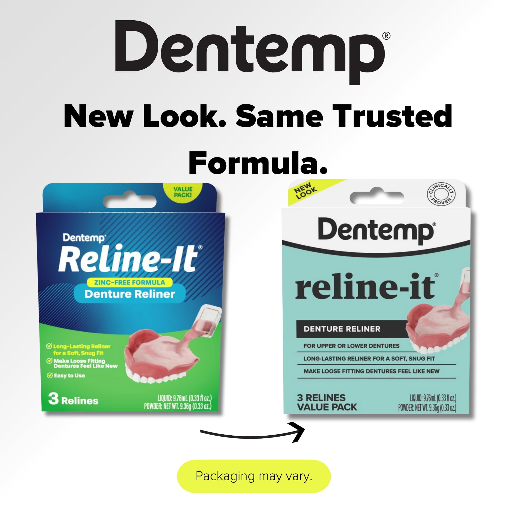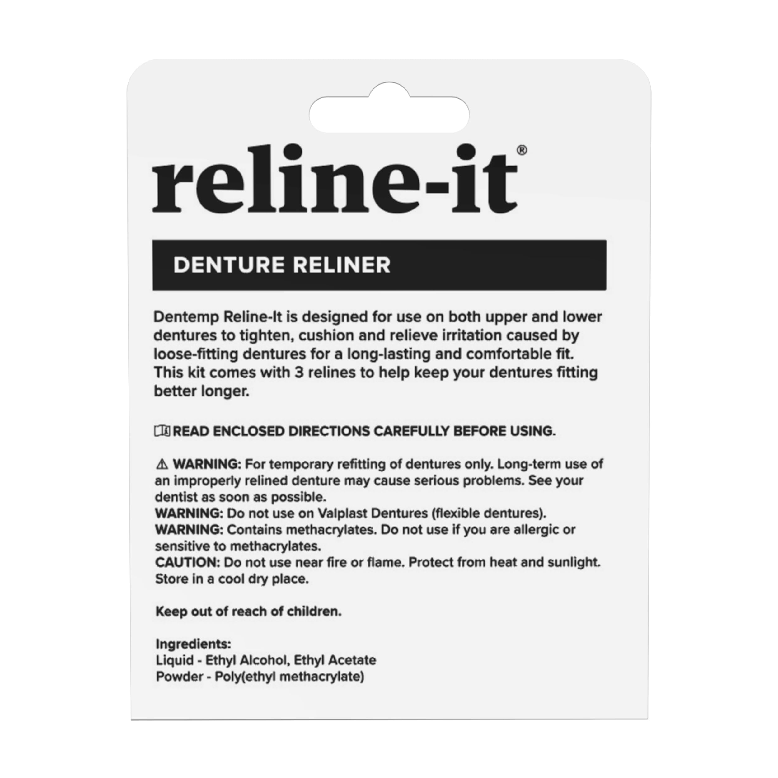 DENTURE RELINER FOR A PERFECT FIT: Dentemp Reline-It restores your dentures to a like-new fit, offering an easy, affordable solutions for loose dentures. Unlike thick layers of denture adhesive, cushions, or strips that can slip, wear out, or cause discomfort, Reline-It tightens and cushions your dentures for a secure, stable, and irritation-free fit.