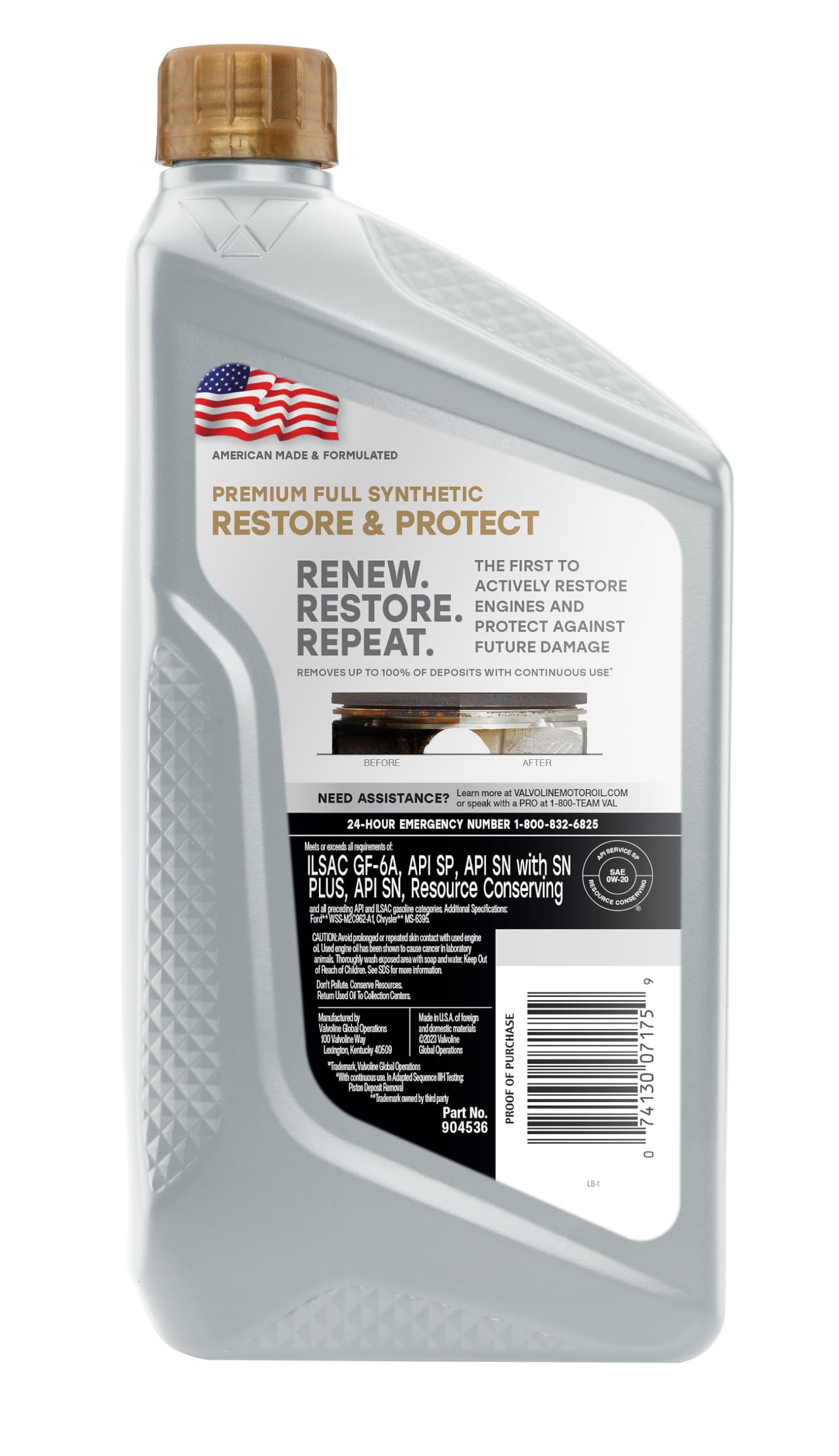 Restore & Protect Premium Full Synthetic is the biggest breakthrough in motor oil since Valvoline introduced it 150 years ago. With continuous use, Valvoline’s proprietary Active Clean technology removes up to 100% of deposits, while its exclusive Liqui-Shield technology works to prevent future deposit formation. A clean engine minimizes friction between metal surfaces, helping to improve fuel economy. Valvoline Restore & Protect is the best motor oil for any age vehicle, from a new car’s first oil change to high-mileage vehicles. There’s no other motor oil like it. Valvoline Restore and Protect Premium Full Synthetic helps maximize fuel economy, horsepower, and engine life. We made it first, so you can keep your pistons factory clean. Renew. Restore. Repeat. (*with regular oil changes. In Adapted Sequence IIIH Testing: Piston Deposit Removal) The best motor oil for any age vehicle, from your new car’s first oil change to high-mileage vehicles.