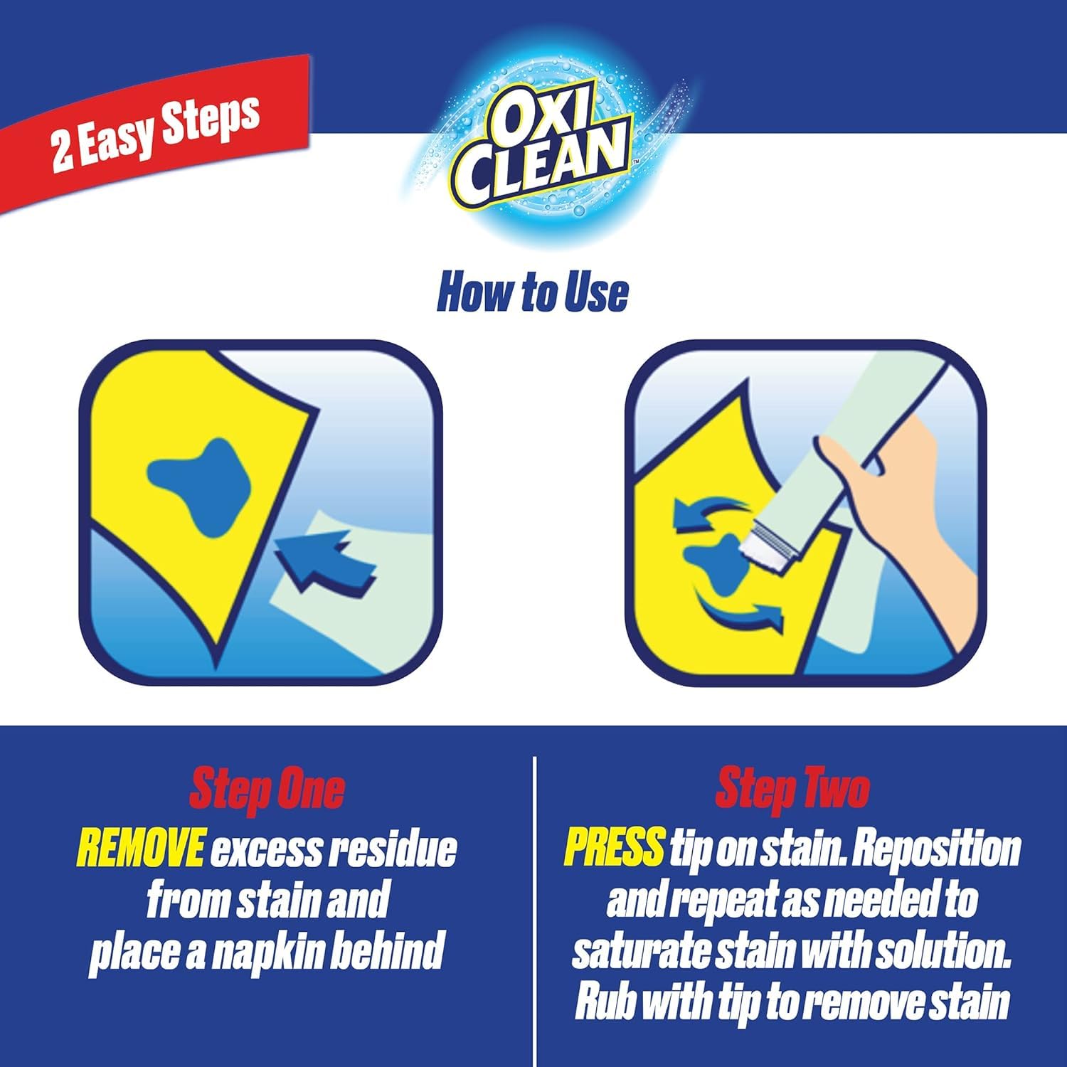 OxiClean On the Go Stain Remover Pen helps tackle fresh, tough stains on your clothes and laundry. This to-go stain removal pen has a uniquely designed applicator with a stain fighting scrubber tip that helps power out stains including coffee, makeup, lipstick, chocolate, spaghetti sauce, soy sauce and more. It's safe and effective formula doesn't leave any residue on your clothes and is safe for all colorfast washable fabrics. It does not contain bleach!! The portable stain removal pen is specially formulated to remove the most common "On the Go" stains. Its convenient travel size makes it easy to carry with you on-the-go. With 2 easy steps, your clothes and fabrics will be stain-free in no time. Simply remove any excess residue from the stain and place a napkin underneath. Then squeeze the stain remover pen and use the scrubber tip like an eraser to eliminate the stain. Includes 3 pens.