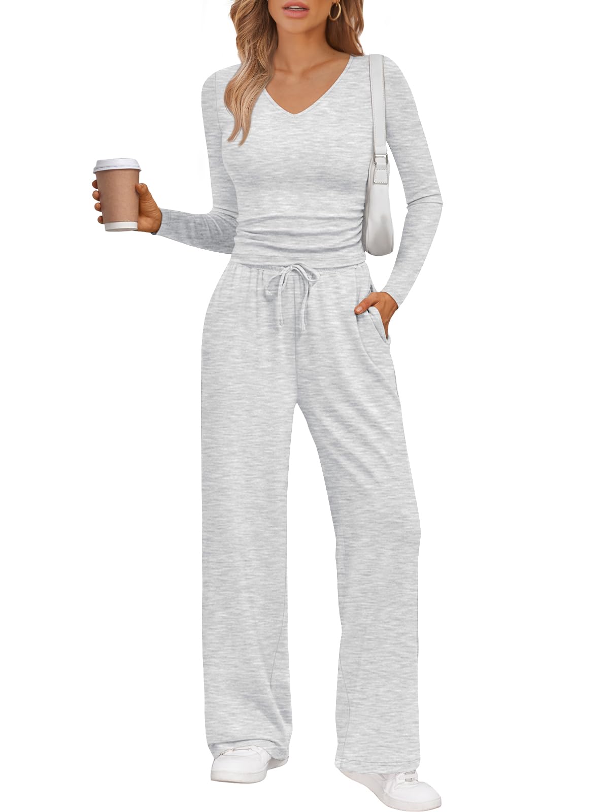 Design & Style: With a sleek crop top and wide-leg pants, this set is designed for those who love a mix of style and relaxation. The side ruching adds a touch of elegance, while the drawstring waist on the pants guarantees a comfortable fit that moves with you.
