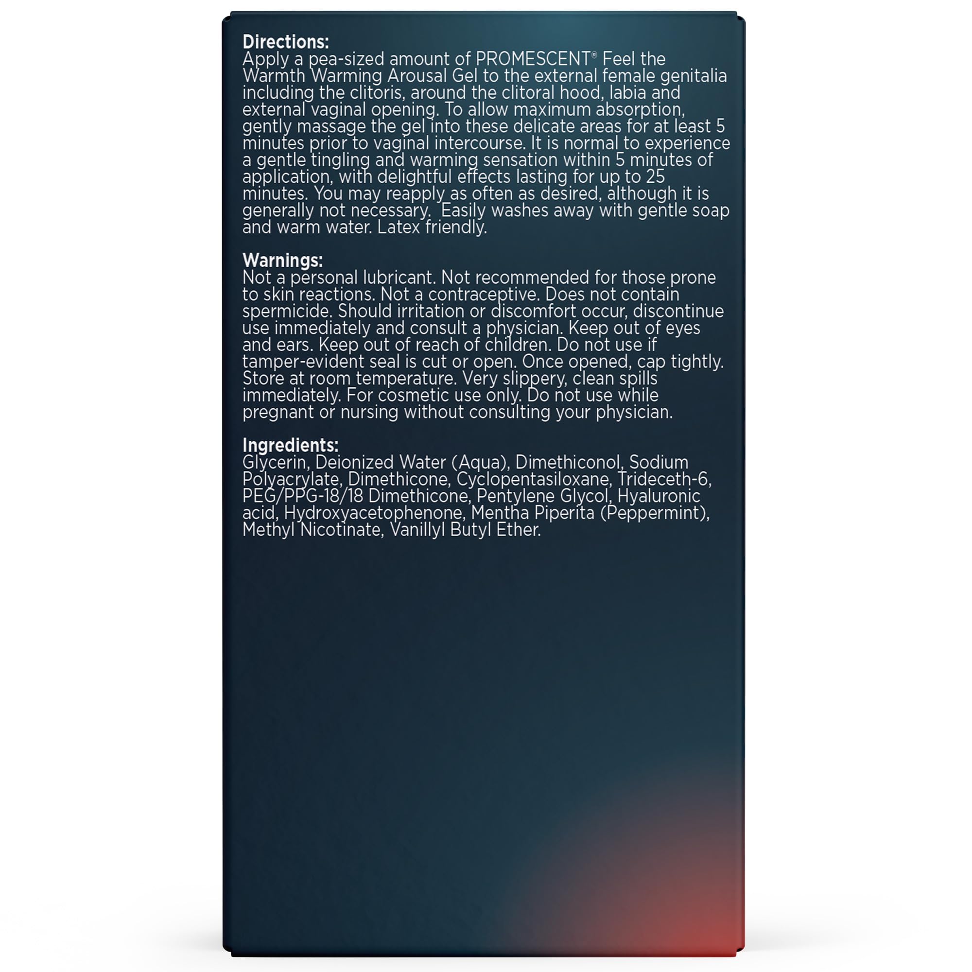 Promescent Warming Gel for Women Discover a more comfortable and connected personal care experience with Promescent Warming Gel for Women. Thoughtfully formulated and carefully developed, this lightweight gel provides a gentle warming sensation designed to support comfort and confidence during everyday intimate care. Gentle Warming Sensation Our formula creates a subtle warming effect that helps enhance awareness and comfort, delivering a soothing, pleasant sensation on the skin. Skin-Friendly Formula This glycol-based gel is pH balanced and paraben-free, making it suitable for sensitive skin. It is designed to apply smoothly and rinse away easily without irritation. Smooth, Non-Sticky Feel The lightweight, non-sticky texture absorbs cleanly and provides a silky feel without residue, supporting a more comfortable and natural experience. Compatible with Accessories The formula is designed for use with most personal devices and latex condoms, offering added versatility and ease of use. Discreet Packaging Every order is shipped in plain, discreet packaging to protect your privacy. Experience everyday comfort and confidence with Promescent Warming Gel for Women.
