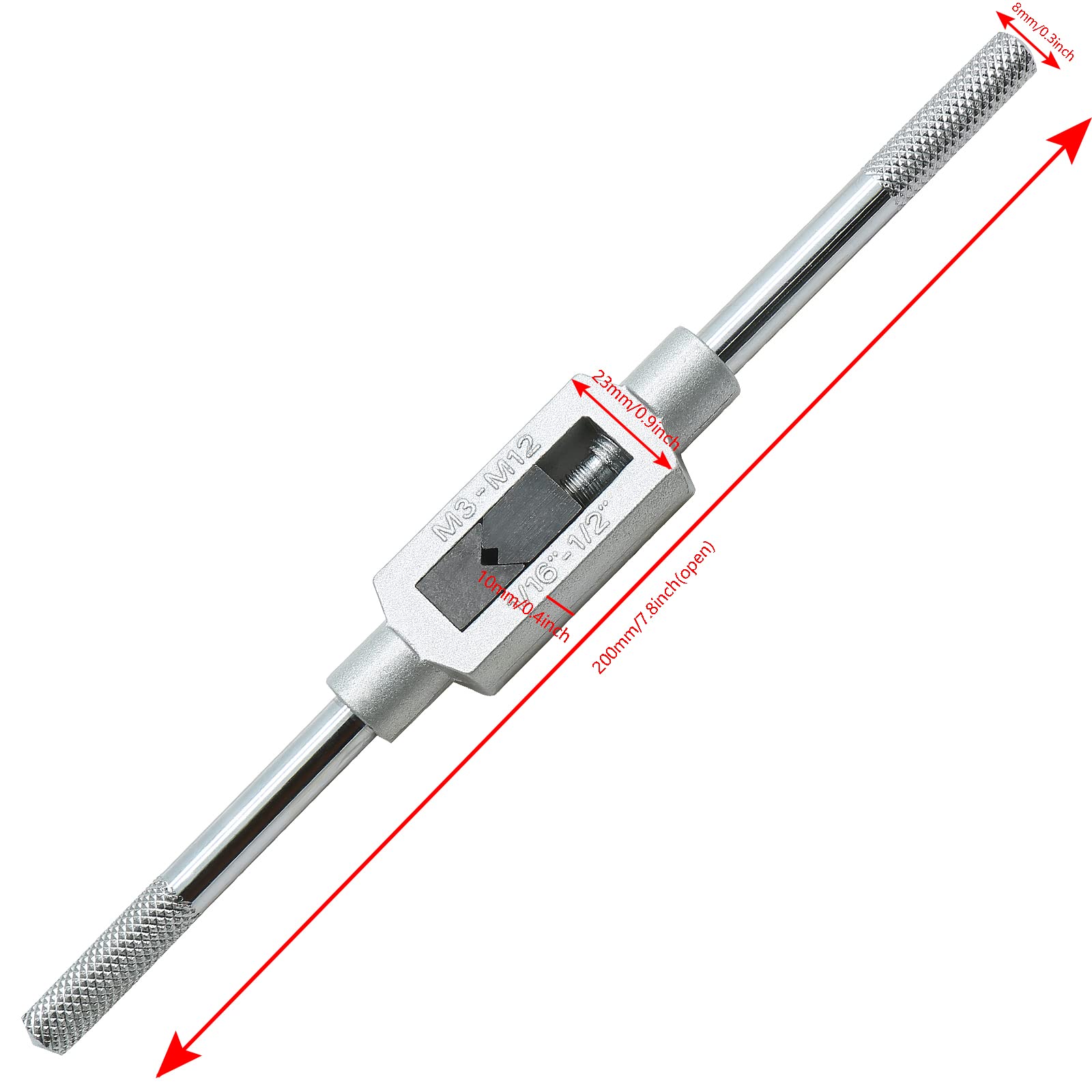 WHAT WILL YOU GET - You will get a M3-M12 tap wrench. Fit 1/16" - 1/2" / 2.5mm - 12mm capacity size. Overall size(closed) is 19.3cm x 2.3cm x 1cm/7.6inch x 0.9inch x 0.4inch(LxWxH). Shank diameter is 8mm/0.3inch.