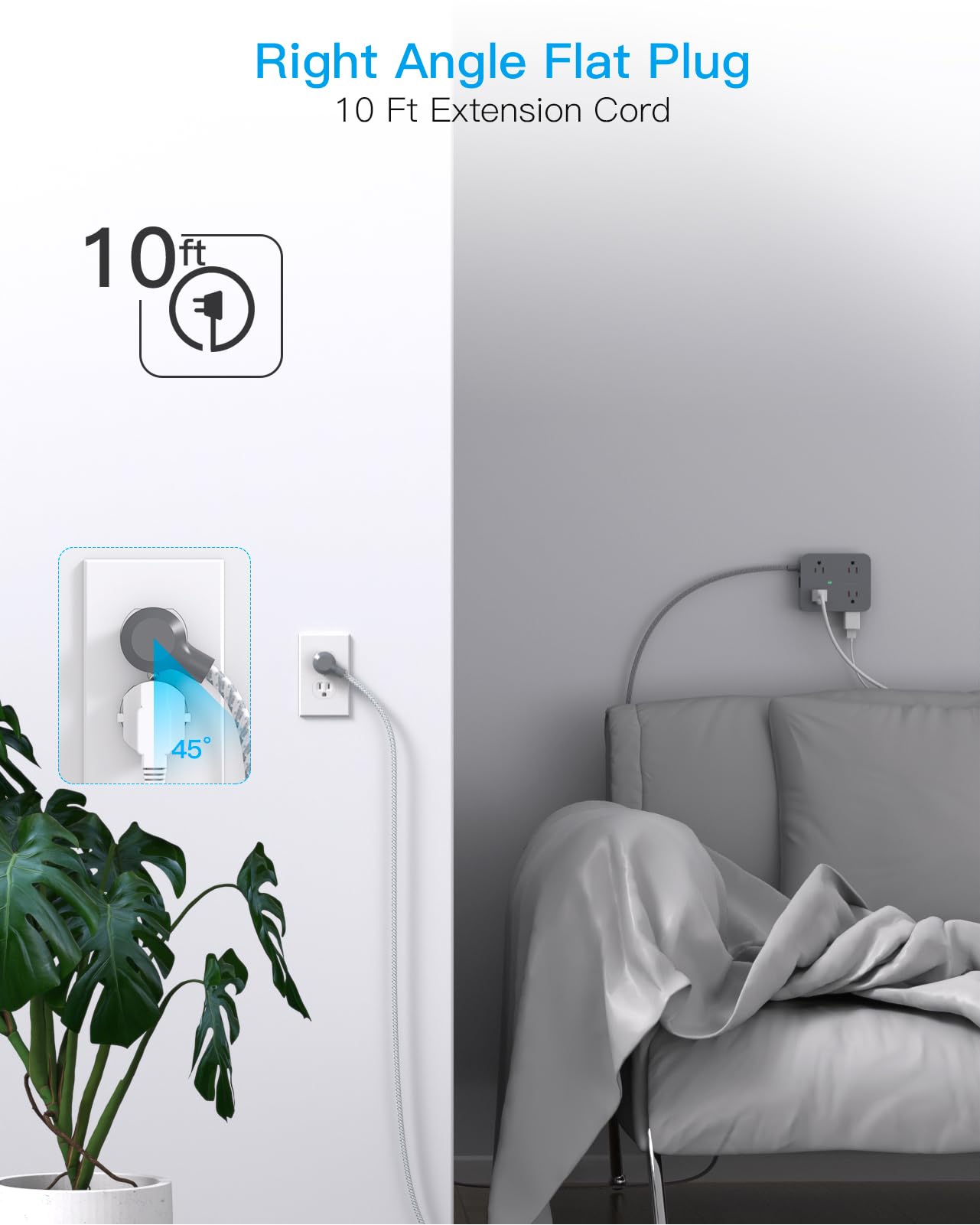 【10 Ft Extension Cord with Flat Plug】- The low profile flat plug fits easily in tight spaces; and the right angle flat plug design prevents bottom plug blocking; the 10 Ft braided extension cord is made of pure copper, which has better current carrying capacity (15A), is not easy to deform, durable and more safety; the two mounting holes on back allows this power strip to be securely installed in various applications.