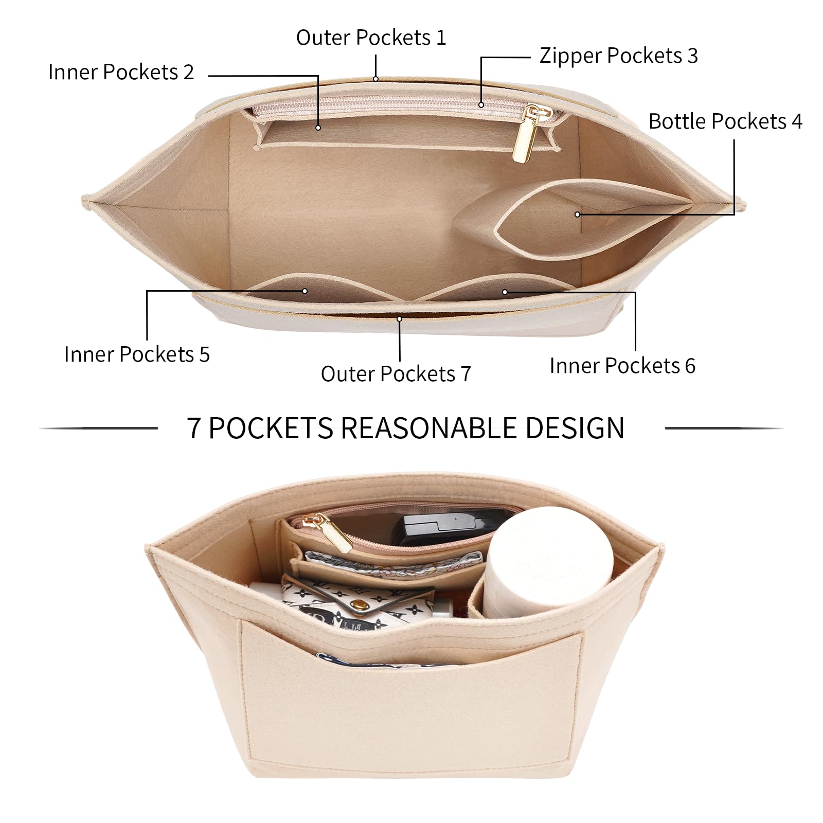 💝 HIGH CAPACITY-MULTI-COMPARTMENTS: Featuring 7 compartments,Two of the pockets, which are exterior pockets, are for storing large items,Five pockets remain, one cup pocket opening and one zippered pocket(Made with high quality metal zipper head for long lasting use)You could store your mobile phone, wallet, cosmetics, glasses and other personal items in purse organizer insert, which is easy to switch bags throughout the day without having to reorganize.