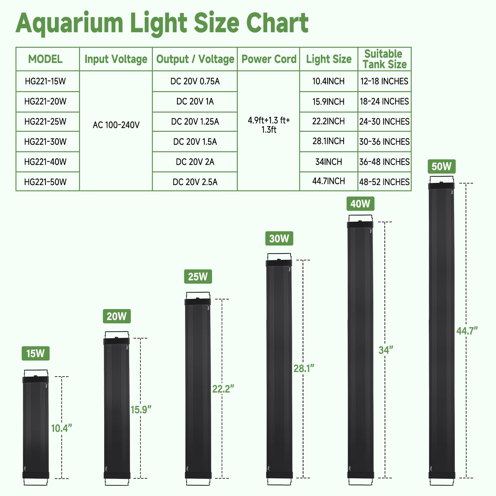 【Adjustable Bracket & Durable Design】20W fish tank lights extendable brackets fit tanks from 18~24inch (45~60cm). Sturdy aluminum alloy housing ensures efficient heat dissipation, 20,000+ hours lifespan, and is compatible with most rimmed, rimless, glass, or acrylic tanks.