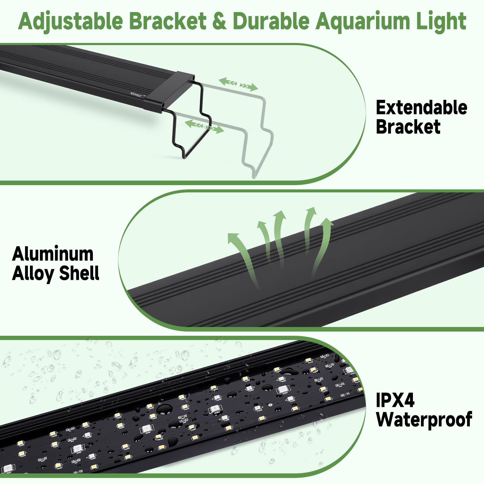 【Full Spectrum LED Plant Growth】Equipped with premium 5050/2835 LEDs, delivering 6500K white, 665nm red, and 460nm blue wavelengths. With CRI >92, this LED aquarium light maximizes photosynthesis, providing balanced lighting for lush plants and healthier fish.