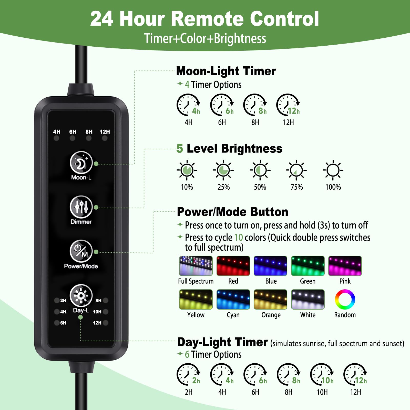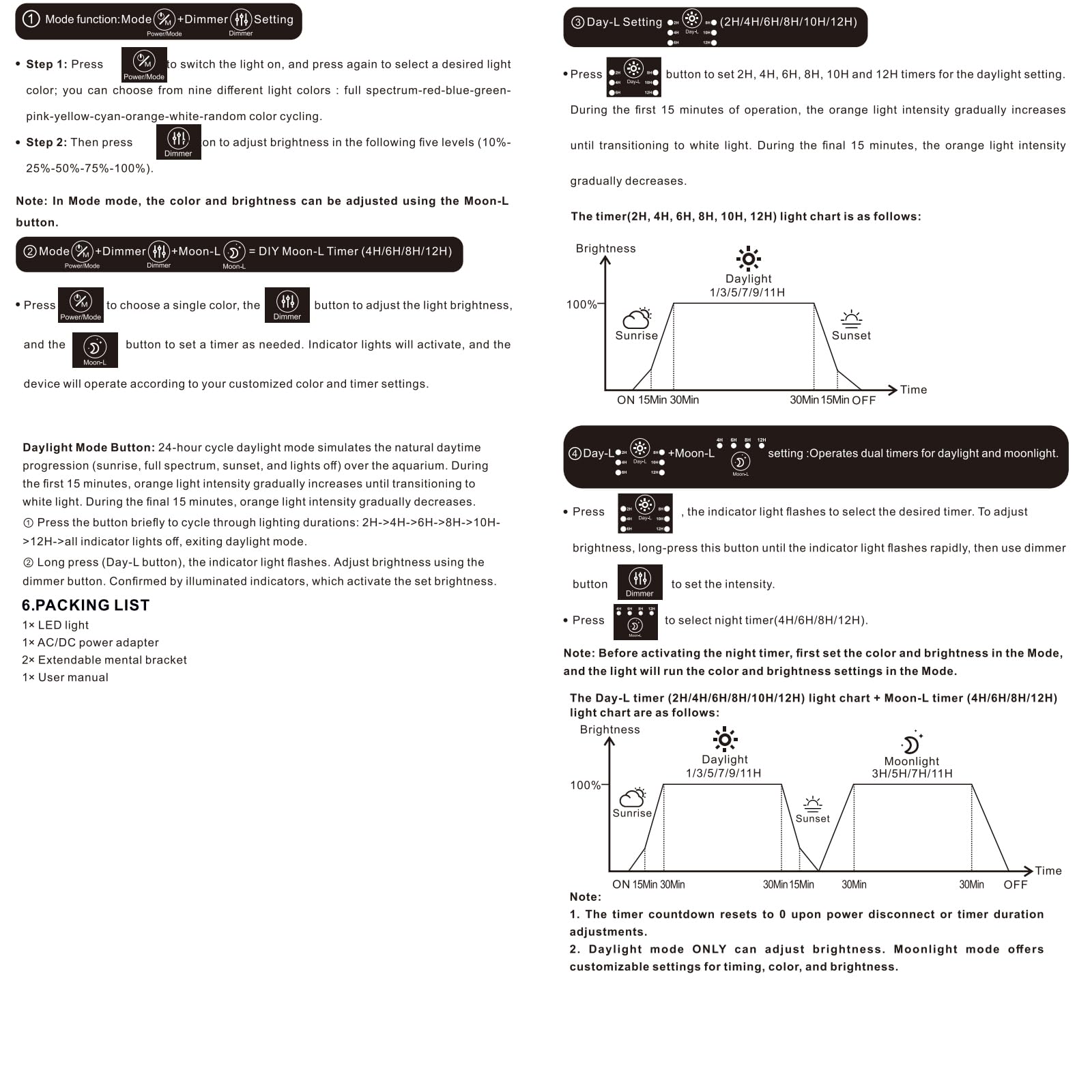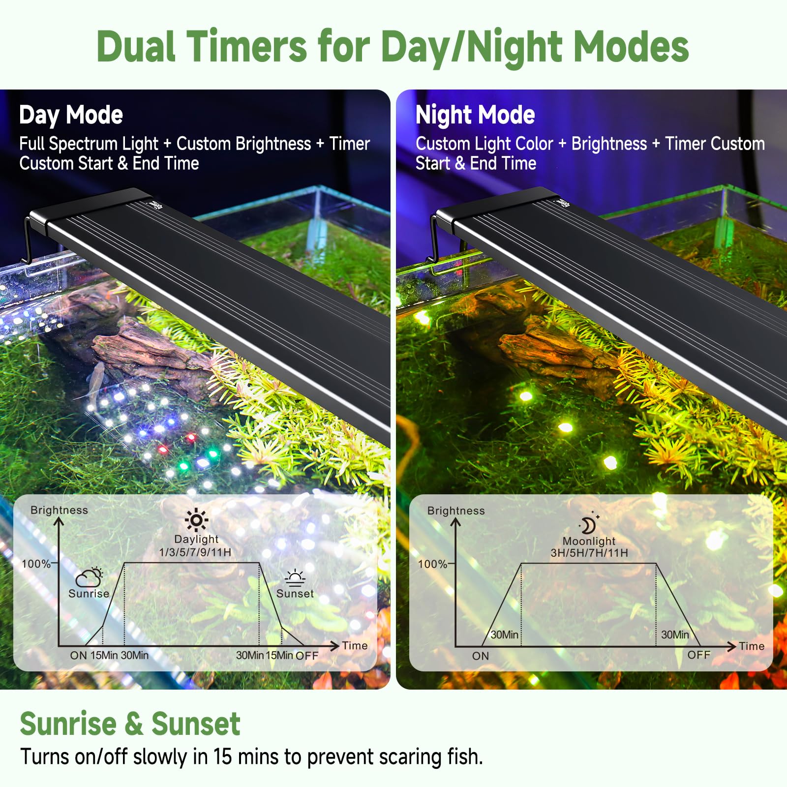 【Dual Mode Pre-programmed Day-L and Moon-L】① Color Cycling: 10 colors + 5 brightness levels (10%–100%) ② Moon-L: Custom color & 4H/6H/8H/12H timer for nocturnal viewing ③ Day-L: Automated daylight cycle with 2H/4H/6H/8H/10H/12H programmable timer and 15-min gradual transition to prevent sudden light changes. The light turns on and off slowly over a 15 minute period so it won’t spook your fish.