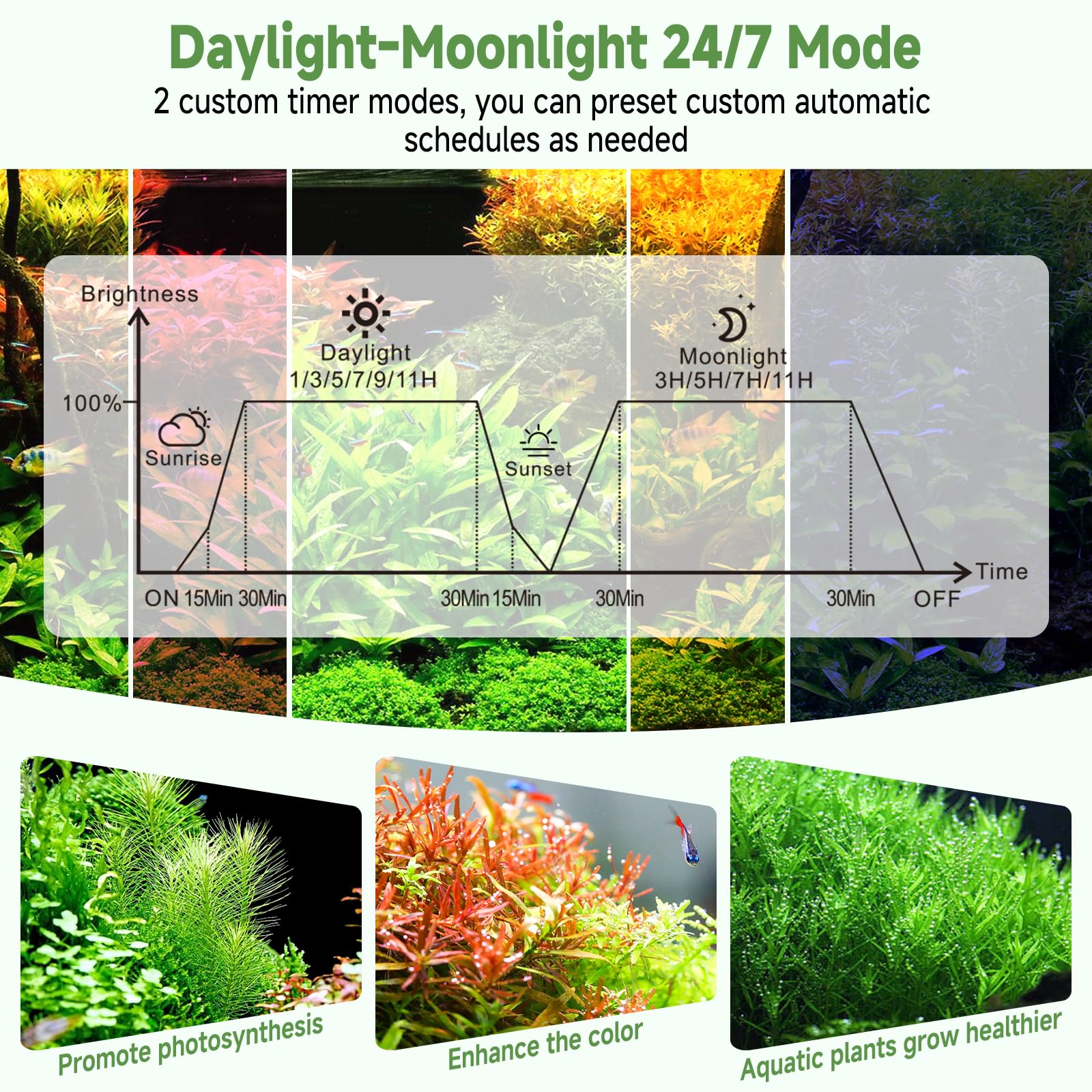 【24/7 Mode】This aquarium light simulates natural sunrise and sunset, starting with warm orange light at sunrise, to bright full spectrum light at noon and starry blue light at nighttime, creating a natural day-night rhythm. Helps reduce fish stress and supports vibrant plant growth for a healthier freshwater aquarium.