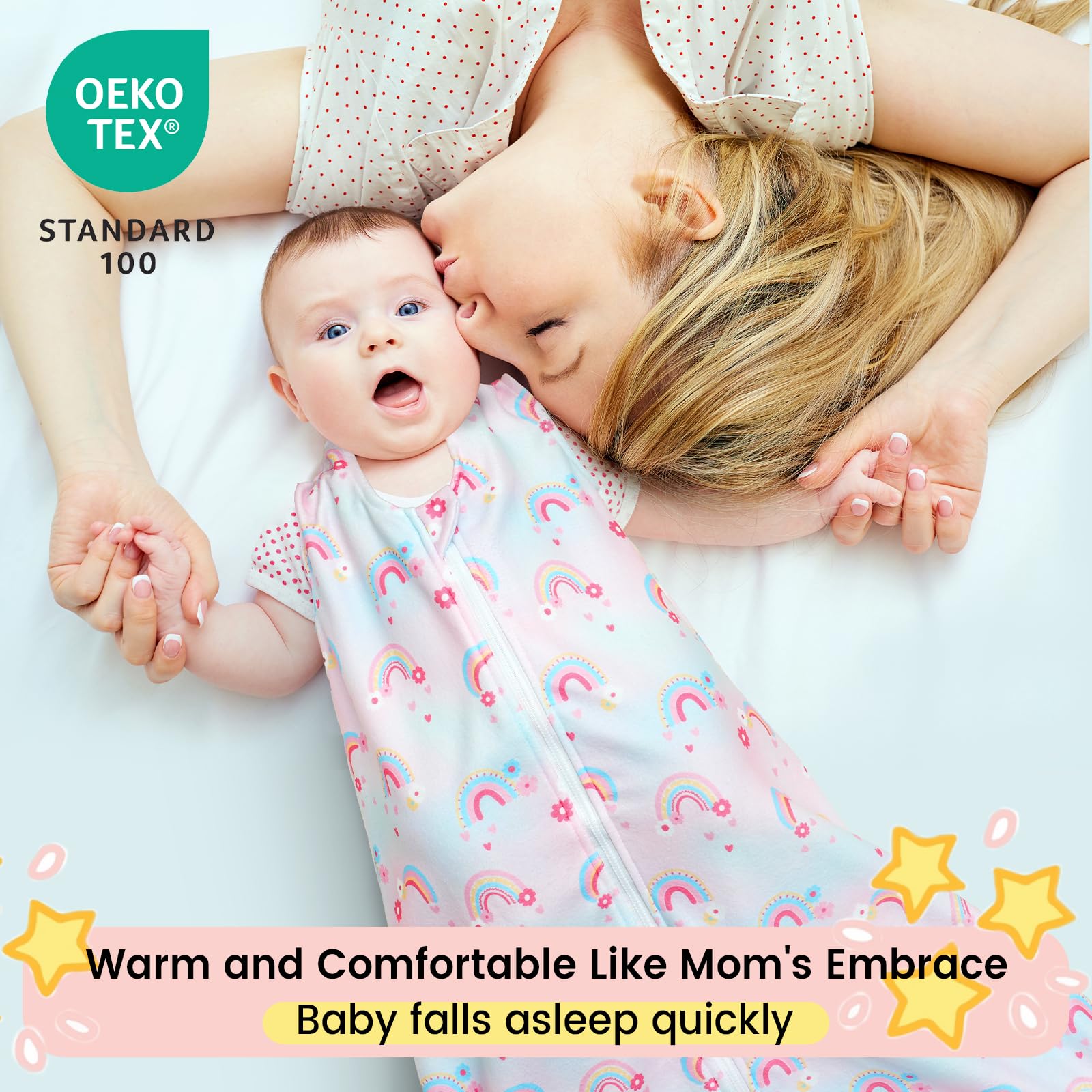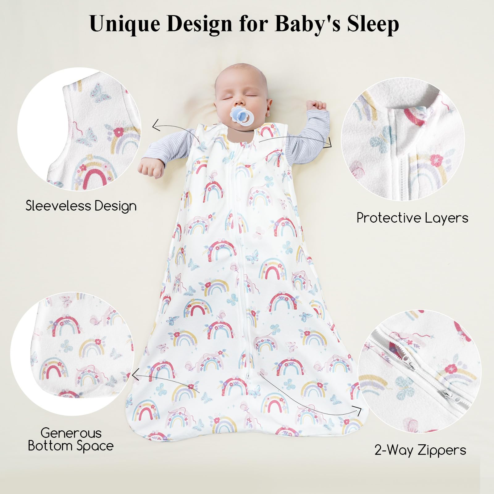 Generous Bottom Space and 2-way Zipper: Our sleeping bags have generous bottom space that allows your baby to kick and move their legs freely. The 2-way zipper makes it easy for you to change your baby's diaper. Our sleep sacks come with protective layers that prevent the zipper from accidentally scratching your baby. The sleeveless design allows free movement of your baby's arms, making it easier for them to roll over and sleep comfortably.