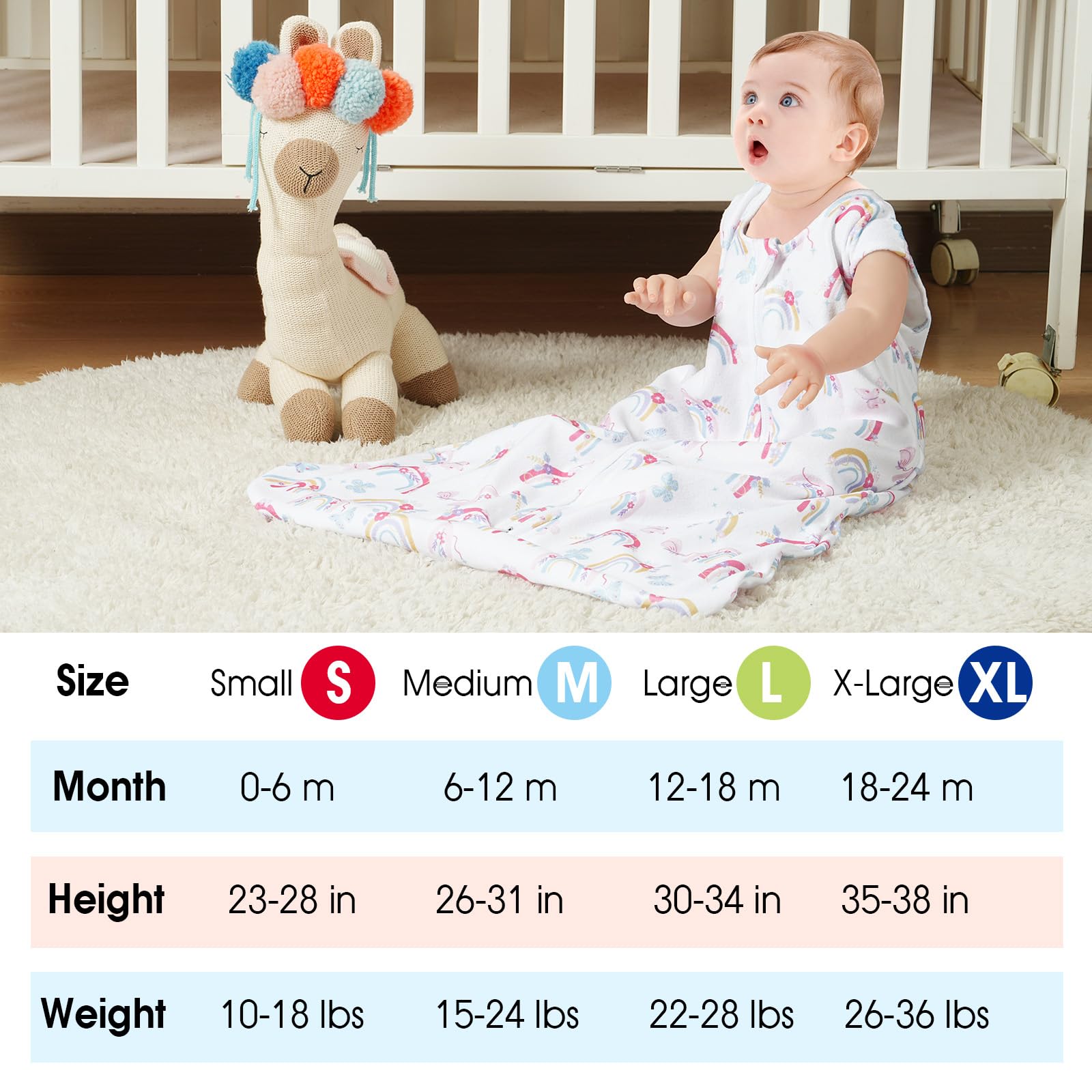 Multiple sizes: There are four sizes available for sleep sacks: small, medium, large, and X-large. Each size is suitable for a specific age range and weight of the baby, as well as their height measurements. Small is for babies 0-6 months (10-18 lbs, 23-28 in), medium is for babies 6-12 months (15-24 lbs, 26-31 in), large is for babies 12-18 months (22-28 lbs, 30-34 in), and X-large is for babies 18-24 months (26-36 lbs, 35-38 in).