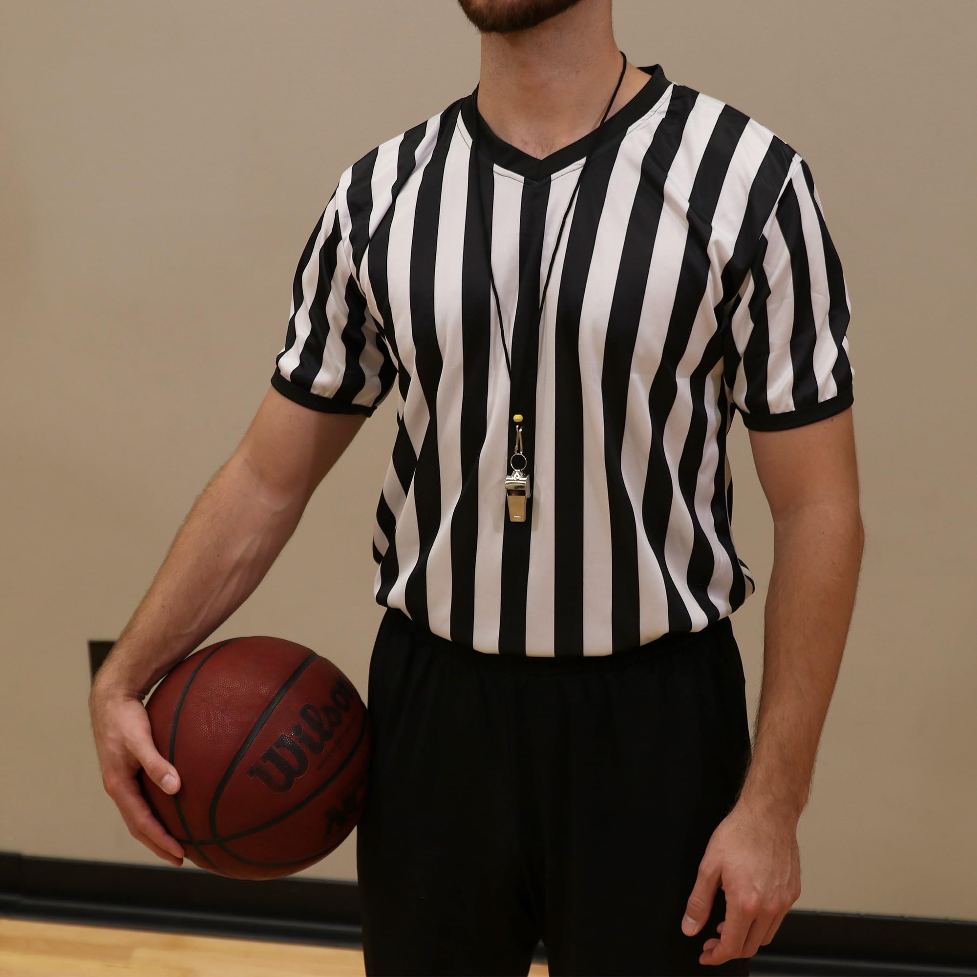 Professional Black & White Stripes: Referee shirts that meet the standard athletic build with 1” black and white stripes with ribbed sleeves and v-neck collar