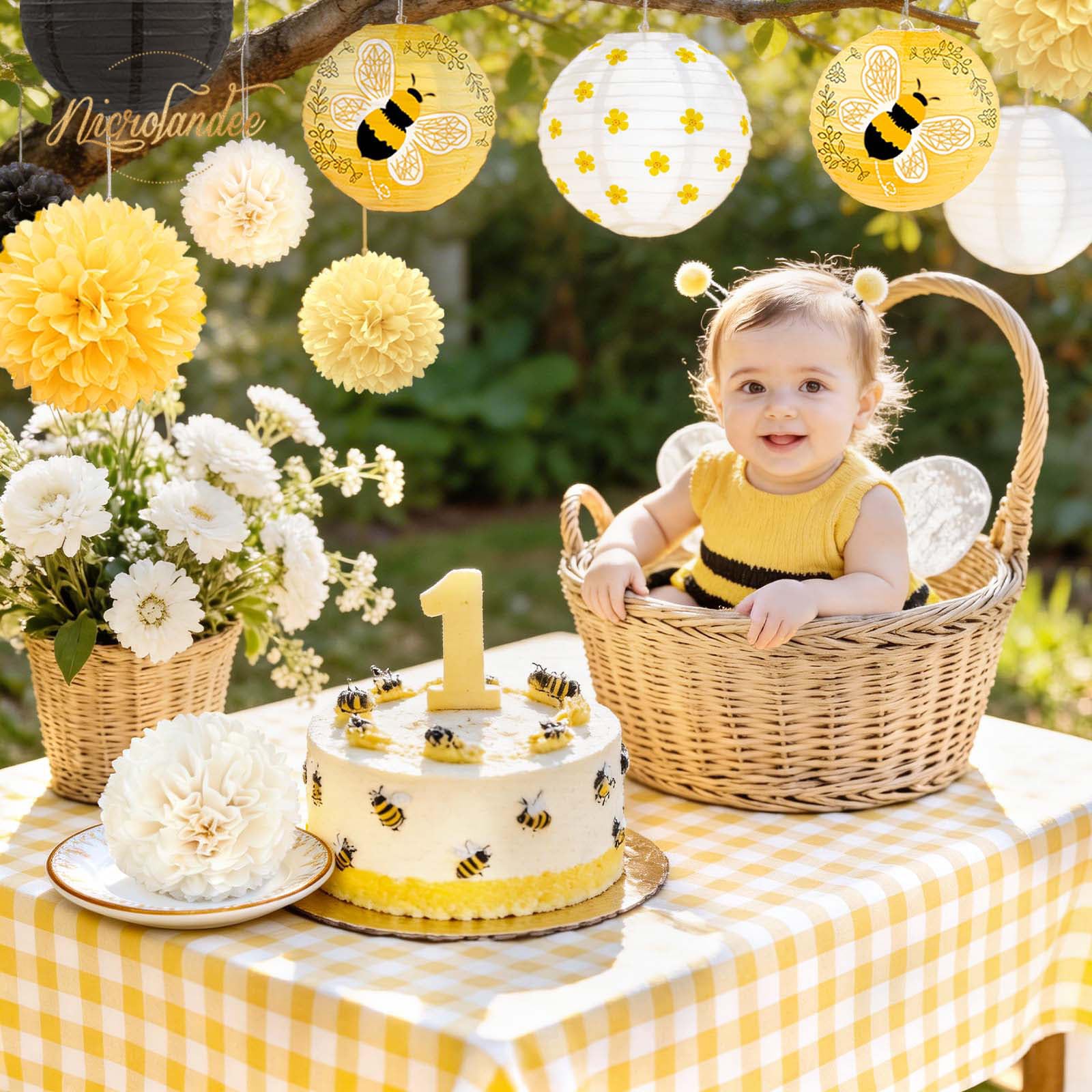 Cute Bee Flower Party Decorations: This paper lantern and tissue pom poms decor with yellow flowers and bee pattern is a suit for bee birthday party decorations, add a unique atmosphere to your party
