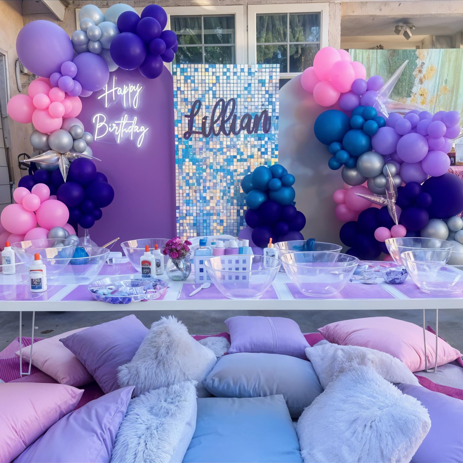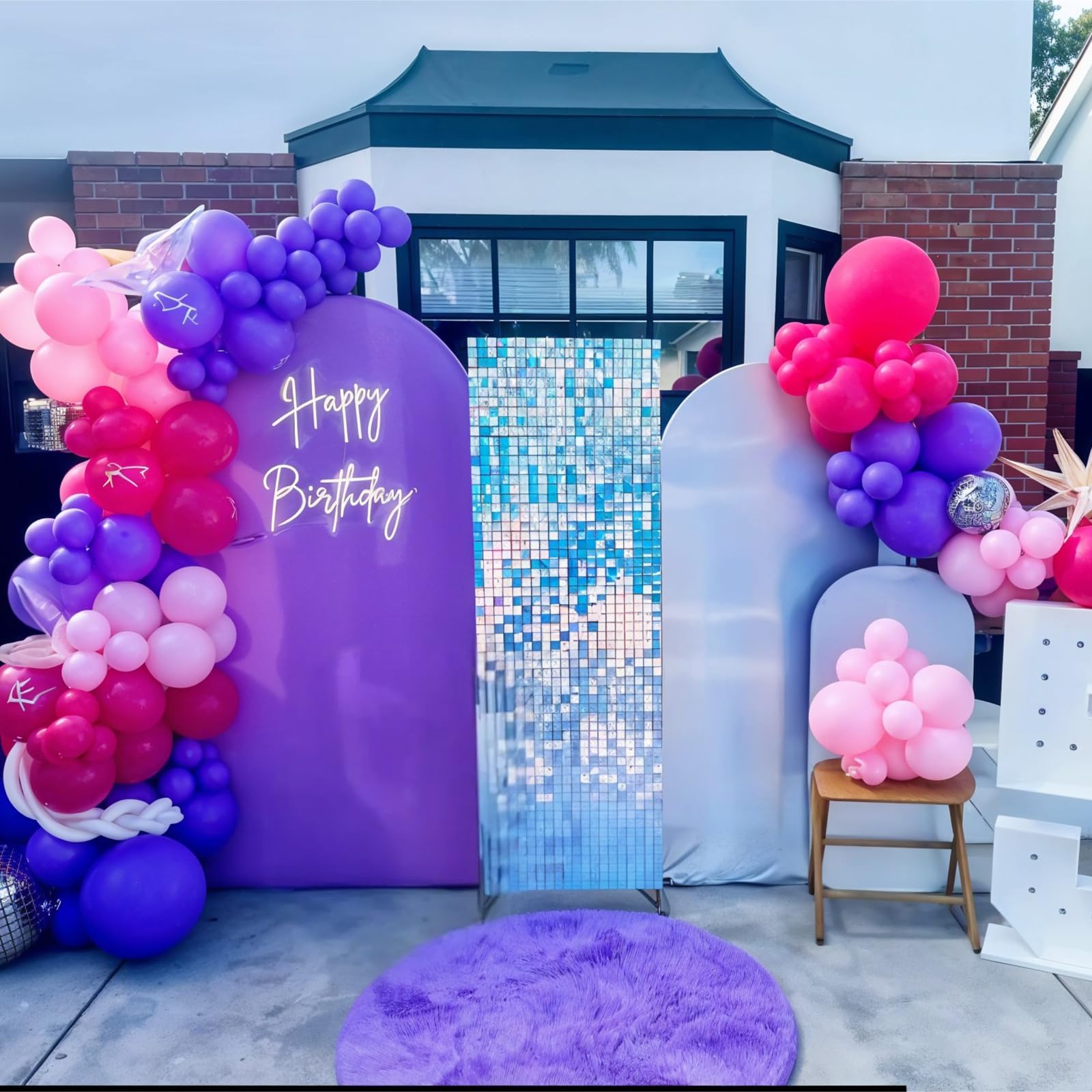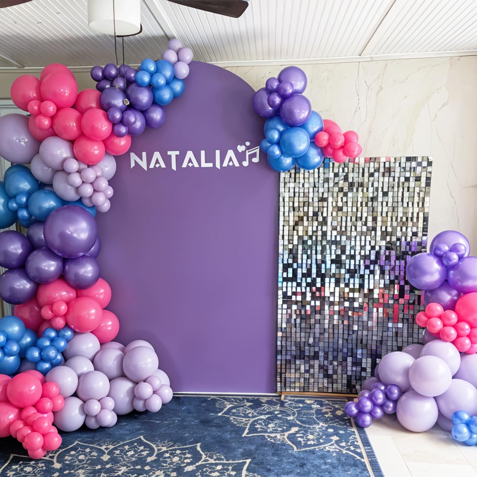 Variety of Colors: Includes 12 inch 9 pcs deep purple balloons, 12 in 9 pcs blush pink balloons, 12 in 8 pcs hot pink balloons, 12 in 8 pcs metallic blue balloon, 12 in 8 pcs chrome purple balloons, 12 in 8 pcs silver balloons and a roll of balloon ribbon