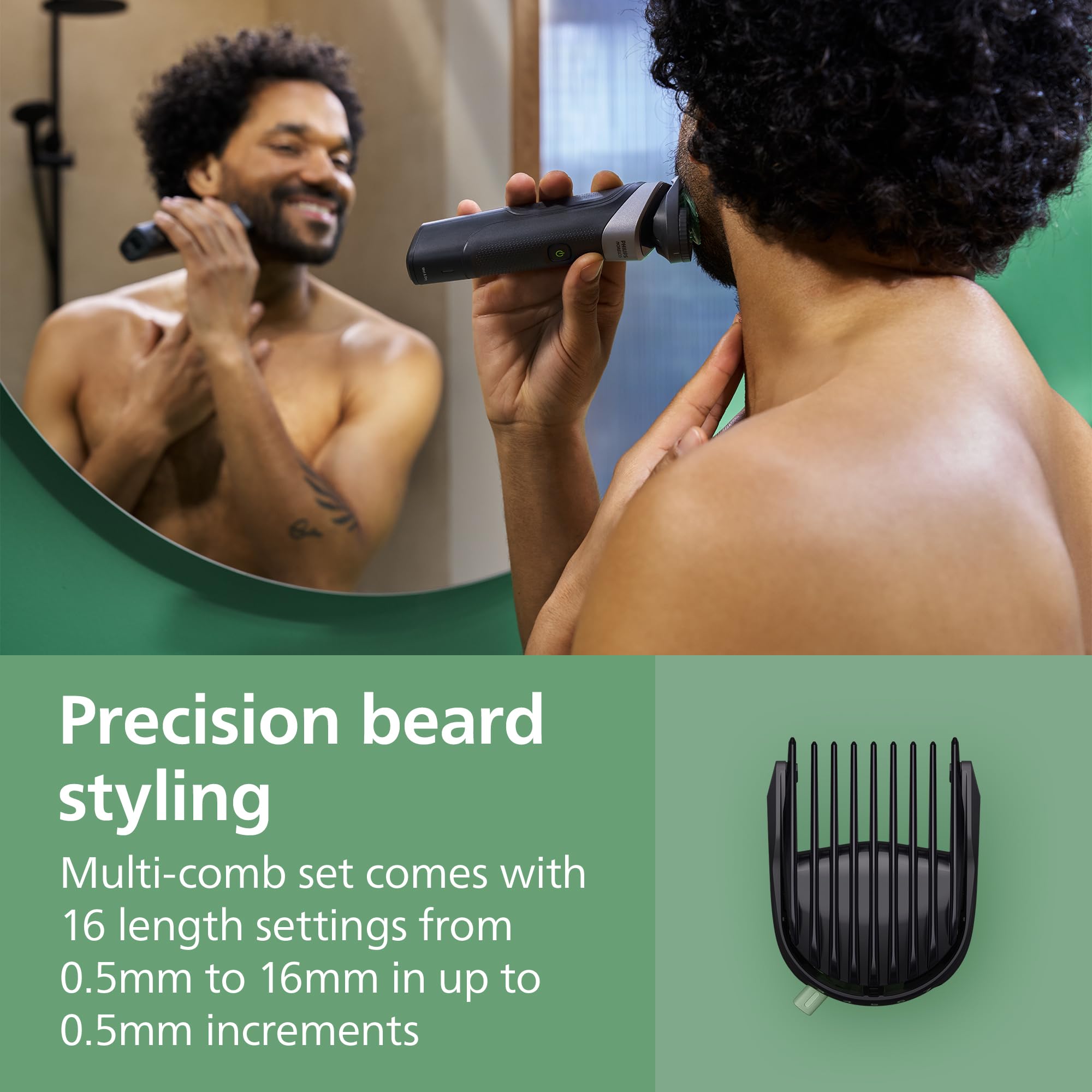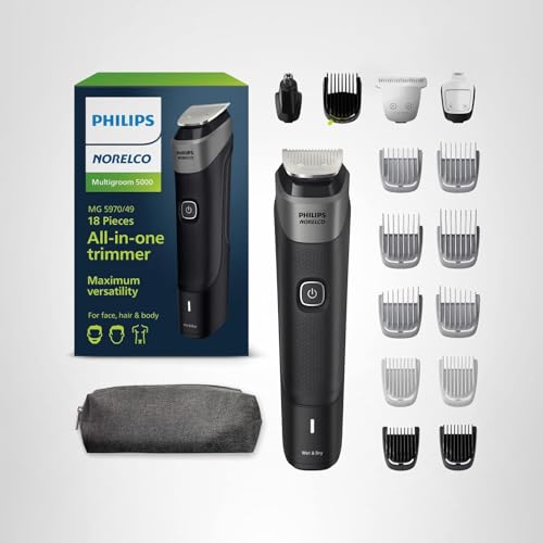 Try out a new look any day of the week with the durable Philips Norelco All-in-One 5000 series hair trimmer for men. With 18 attachments, self-sharpening titanium-coated steel blades for long-lasting precision, and a durable, lithium-ion battery with up to 3-hour runtime, this versatile and efficient electric razor for men efficiently tackles all your grooming needs. It's a hair and beard trimmer men can always rely on! Effortlessly trim and style your beard and hair with precision blades and beard combs that deliver clean, straight lines for your desired look. Use the hair-clipping comb with various length settings to maintain your hairstyle at home. With the click-on body comb ensuring a gentle, effective trim, the device also works perfectly as a body trimmer for men. Plus, you can easily remove unwanted nose and ear hair without nicks or cuts with the nose hair trimmer attachment. Achieve a precise and even trim with self-sharpening titanium-coated blades that deliver added strength for maximum precision, staying as sharp as day one with no blade oil required. Select from 0.5 to 16 mm length settings to craft your desired look to the exact length you want. The premium trimmer is easy to hold and maneuver with an ergonomic rubber grip for superior comfort and control. Built to last, the durable lithium-ion battery offers up to 3 hours of runtime for uninterrupted trimming. The battery indicator keeps you fully informed of your battery status, whether itβs low, empty, fully charged, or still charging, ensuring you're always ready for your next grooming session. With USB-A charging, it's easy to power up anywhere (adapter is not included). The trimmer is 100% showerproof, so you can use it both wet and dry for a comfortable, convenient experience, every time. Plus, itβs easy to clean too.