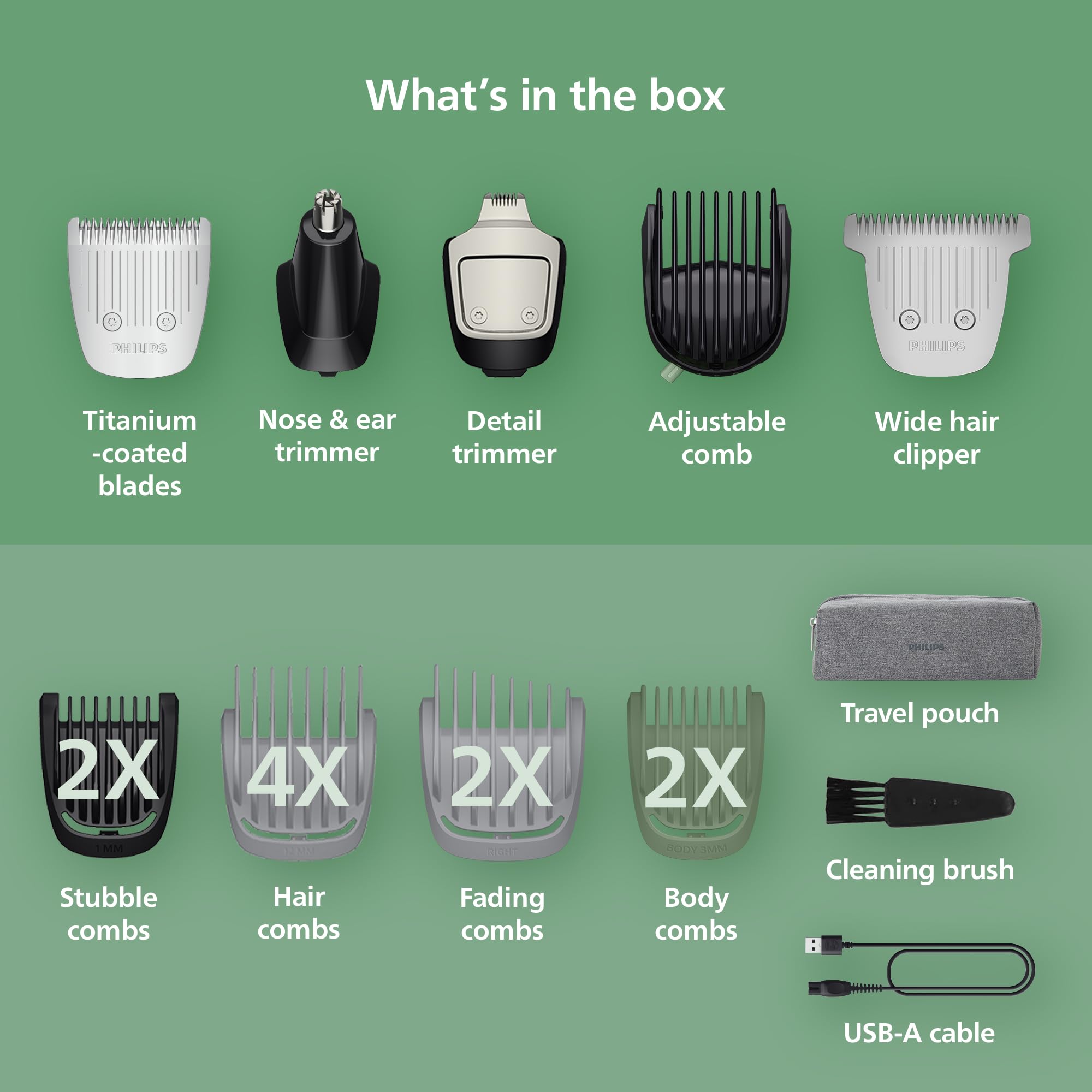 THE SET INCLUDES: 1x Philips Norelco All-in-One Trimmer 5000 Series, 1x full metal titanium-coated blade, 1x wide hair clipper (T-blade), and more; see the "what's in the box" section