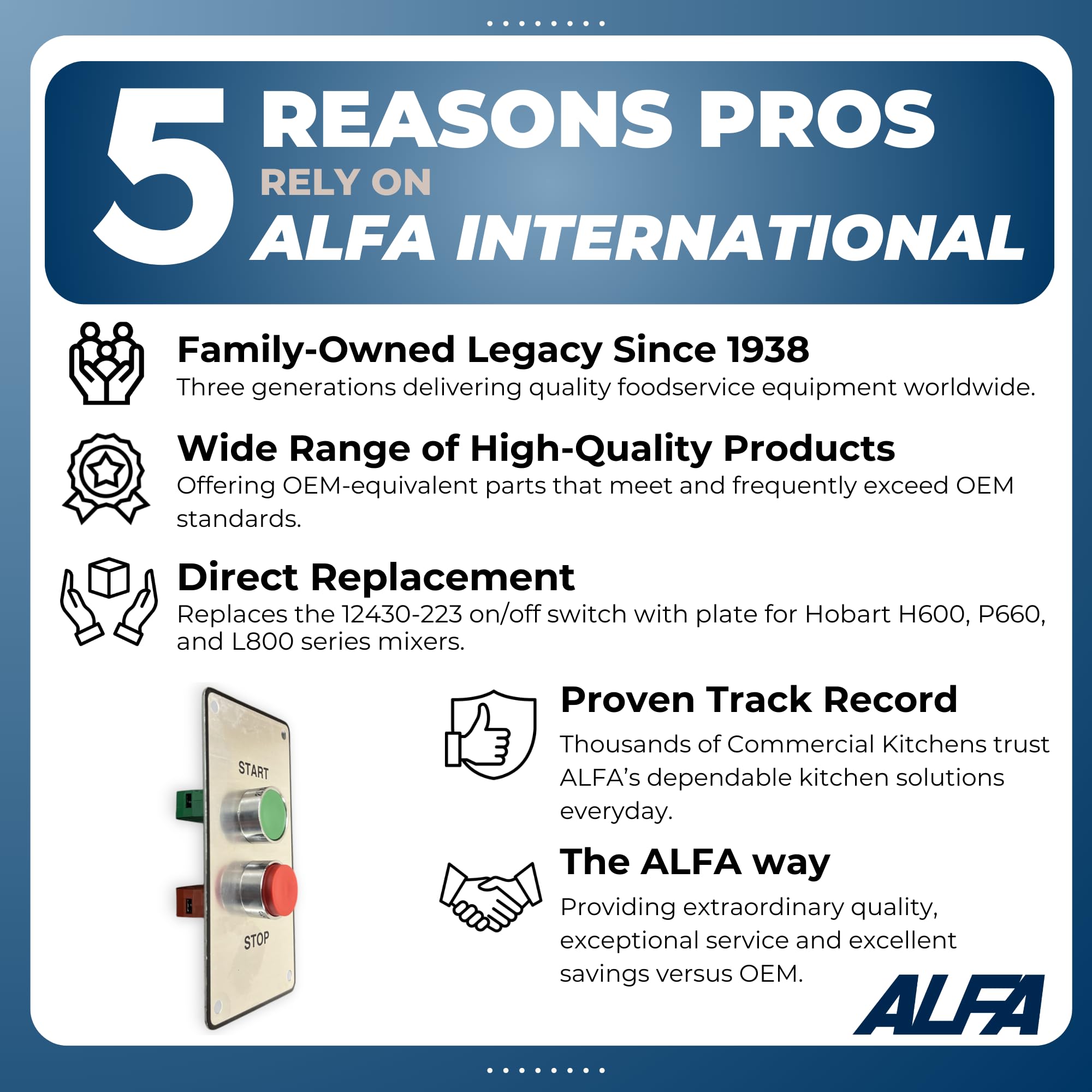 High-Quality, OEM-Equivalent Parts at a Fair Price: ALFA International delivers premium replacement parts that meet or exceed original equipment manufacturer (OEM) specifications, ensuring peak performance of your foodservice equipment at significant savings versus OEM components. ALFA's products have a proven track record in the marketplace that is backed by an industry-leading warranty.