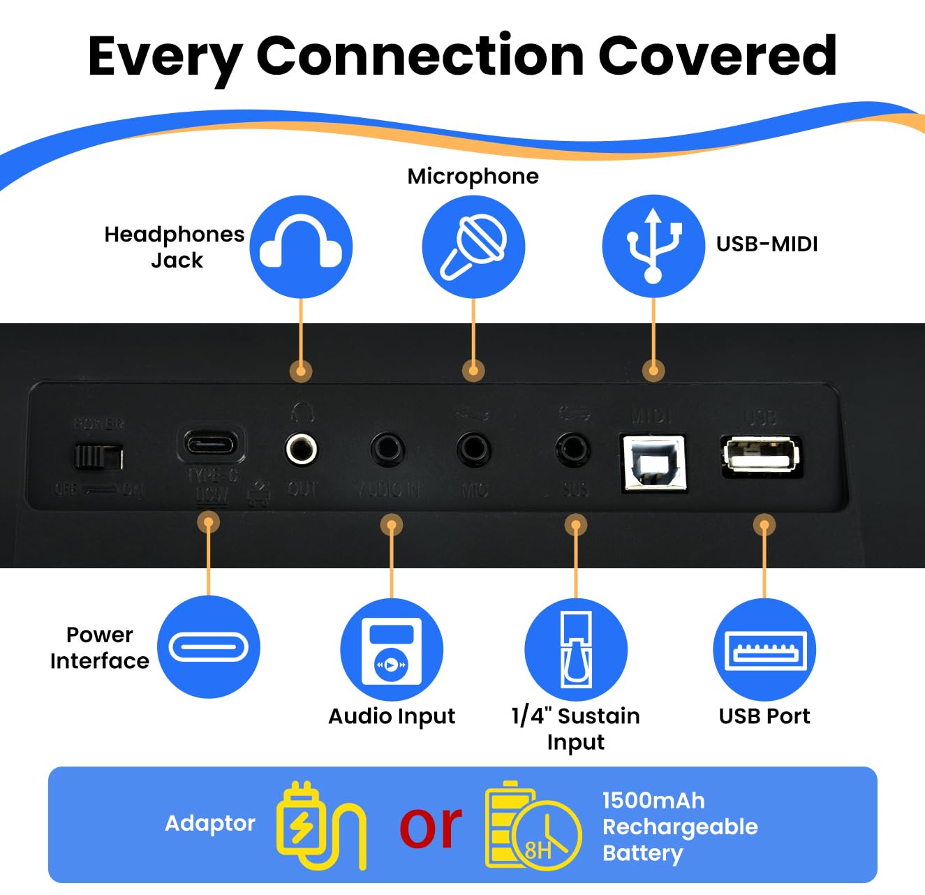 ๐๐จ๐ฆ๐ฉ๐ซ๐๐ก๐๐ง๐ฌ๐ข๐ฏ๐ ๐๐จ๐ง๐ง๐๐๐ญ๐ข๐ฏ๐ข๐ญ๐ฒ๏ผDigital piano equipped with multiple expansion ports including headphone output, audio/microphone input, sustain pedal jack, USB-A, and USB-MIDI ports, it can connect to headphones, computers, smartphones, pedals, U disks, and more. This user-friendly design for beginners not only enables silent practice and learning with apps but also supports singing along while playing, providing continuous support from entry to advanced levelsโmaking piano learning more free and enjoyable.