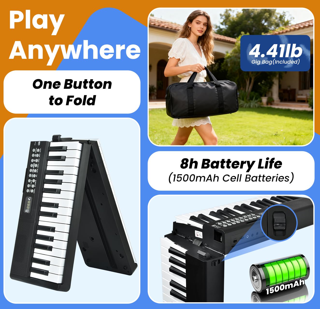 ๐๐๐๐๐ฒ ๐ญ๐จ ๐๐ฅ๐๐ฒ ๐๐ง๐ฒ๐ฐ๐ก๐๐ซ๐๏ผThis foldable keyboard piano features a 180ยฐ foldable, lightweight design and comes with a carry bag for extreme portabilityโmeasuring just 40.2 cm in length and 18.5 cm in width when folded. With a built-in 1500mAh rechargeable battery offering up to 8 hours of playtime, itโs an ideal companion for travel, parties, campus use, or stage performances