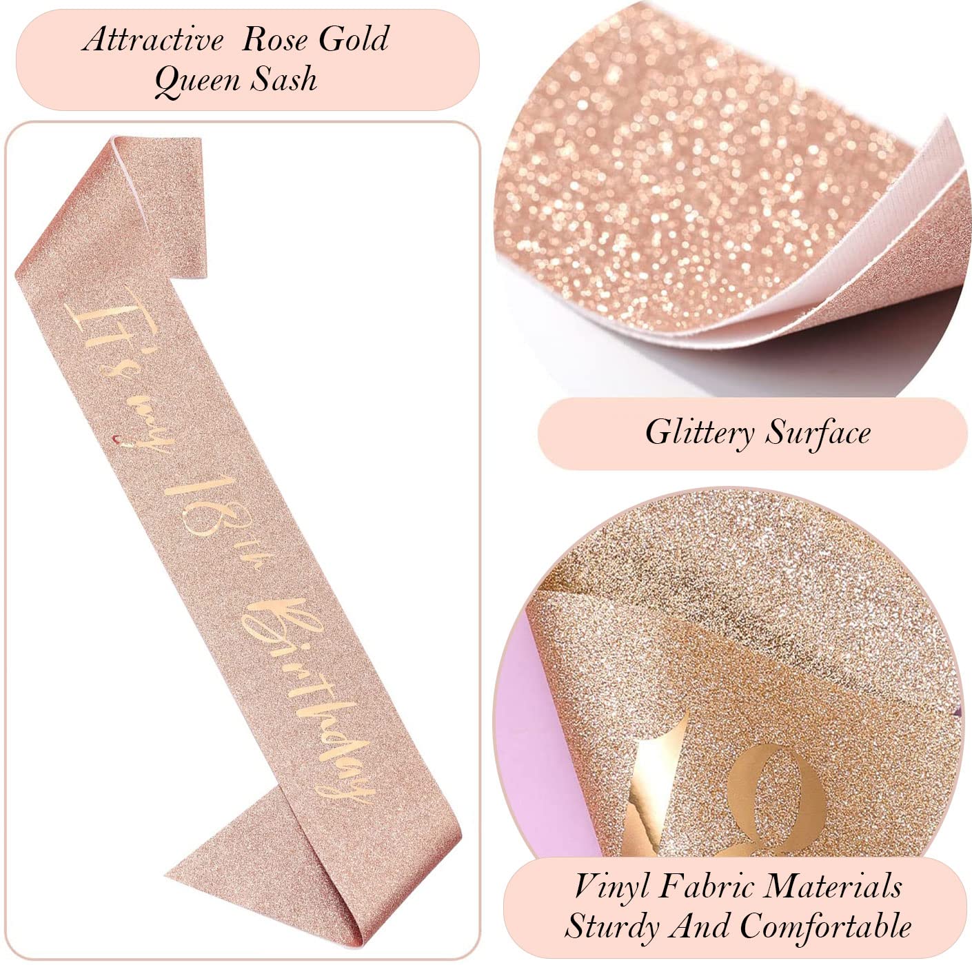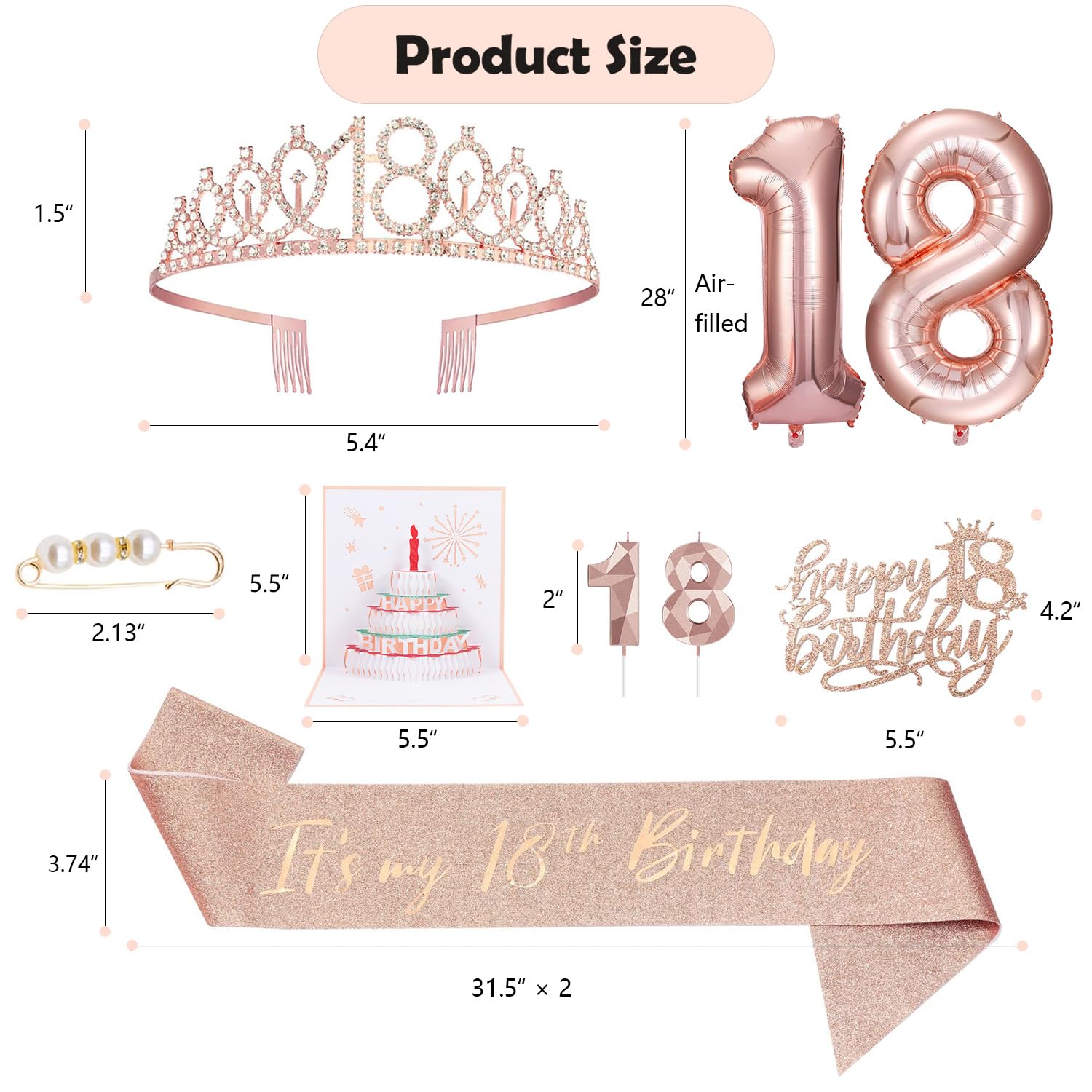 18th Birthday Decorations for Girls: Glittery 18th tiara/crown *1pc, “It’s my 18th birthday” sash *1pc, Happy 18th birthday cake topper *1pc, pearl pin*1pc, 1+8 numeral candles *1set, 1+8 numeral balloons *1set, they are exquisitely packaged in the carton.