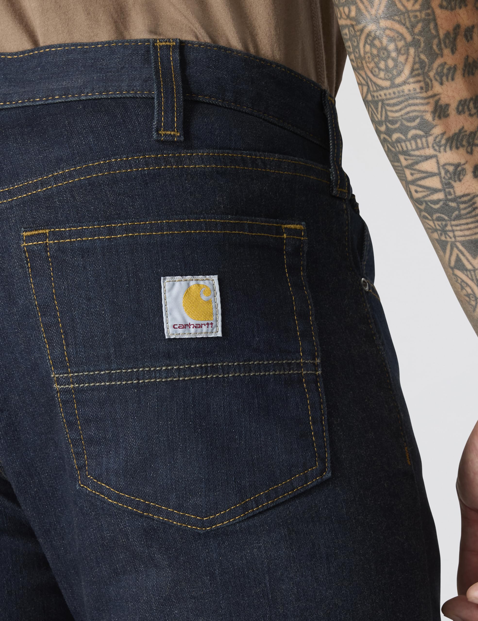 Description These men's work jeans have all the durability you'd expect from a pair of Carhartt pants but with extra flexibility too. The heavyweight denim has some stretch giving you easy movement on the job. The straight traditional fit is cut closer through the seat and thigh with a tapered leg. 12-ounce, 85% cotton / 14% polyester / 1% spandex denim. Built to move with Rugged Flex® stretch technology. Straight Fit: Closer to the body fit through the seat and thigh with room to move and a tapered leg opening. Strong sewn-on-seam belt loops. Front and back pockets. Imported