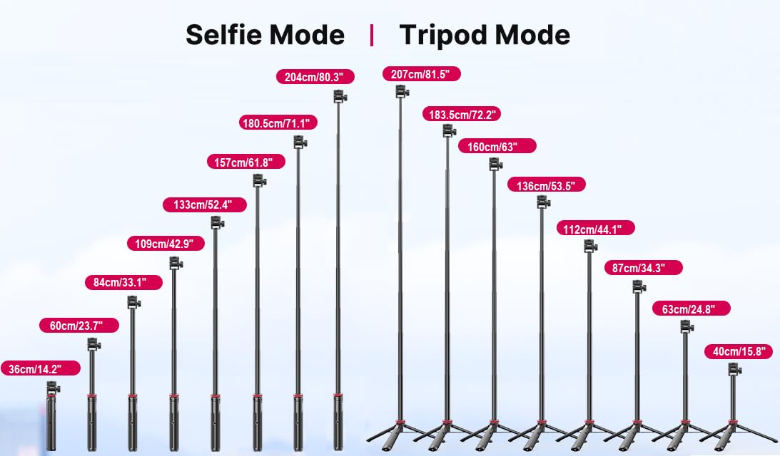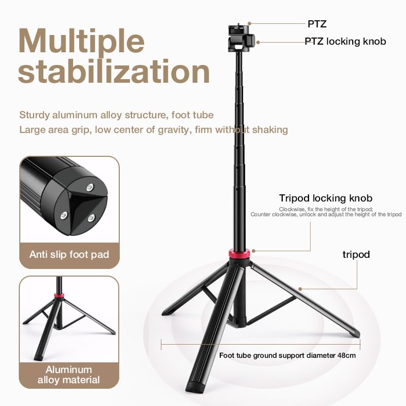 80'' Osmo-Mobile Floor Tripod-Stand Holder for DJI Osmo Mobile SE 7P 7 6 5 4 / Osmo-Pocket 3 2 1 / Osmo Action 5 pro 4 3 2 1 overview: Multiple scenarios,Multiple purpose uses; 1/4''-20 thread, can be connected to Fill Ring Light,Cameras,Mobile phone clips,Action cameras, portable recorders,etc; Aluminum Tripod head can be rotated vertically 180 degree to meet more different angles; Easy foldable designs, easied to hold with on hand,can be stored in 35cm/14.4'' your backpack and carry out with you. Strong Aluminum Tripod Structure,large area of leg grip to 48cm/189'',stable and non-shaking. Suggest max load capacity 1kg/2.2lbs; Tripod total height 2m/81 inches, with 8 sections for telecoping,can suitable your any height request; Univeral Aluminum phone clip can extended from 6-9cm/2.5-3.4 inches, can work on 4-7'' screen size smartphones; Action camera adapter compatible with all action cameras in the market; Package included: 1x 81'' Aluminum Tripod with 14''-20 thread; 1x aluminum phone clip, 1x action camera adapter; compatible with Gopro 4K,hero 13 12 11 10 9 8 7 6; compatible with Logitech C920 C930 C922 C925 StreamCam,MX brio 4k, brio 4K, brio 500,C615 webcams; compatible with Razer kiyo pro ultra 4K, kiyo pro, kiyo X,kiyo webcams; compatible with iPhone 16 15 14 13 12 11 Xr Xs X pro mas; compatible with Samsung Galaxy S24 S23 S22 S21 A35 A15; compatible with DJI Osmo action 5 4 3 2 ,Osmo Pocket 3 2 1,Osmo Mobile 7P 7 6 5 4 3 2 1; Compatible with ZHIYUN Smooth 5S,Smooth 4,Q4,Q3; Compatible with Hohem iSteady M7 M6 X3 V3;