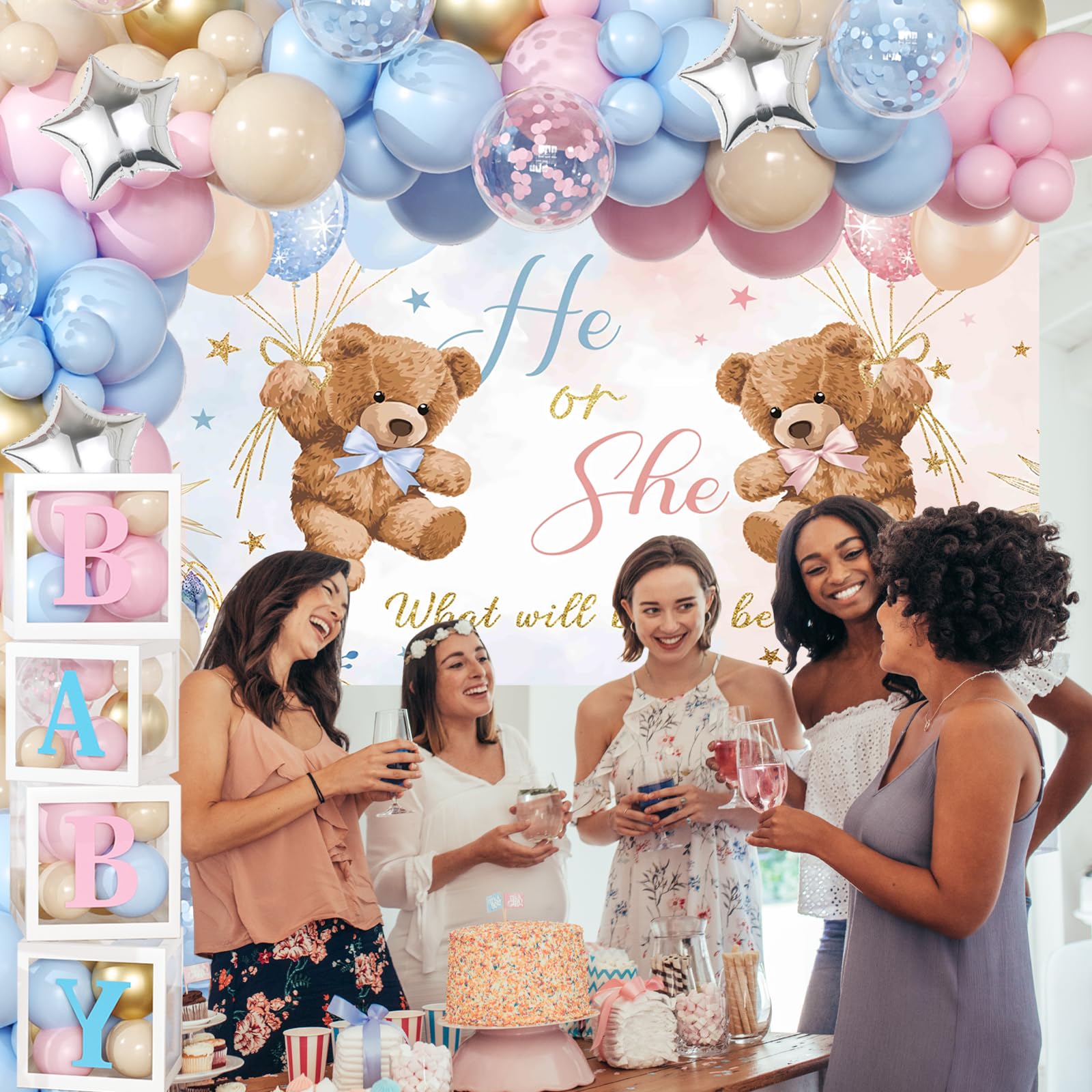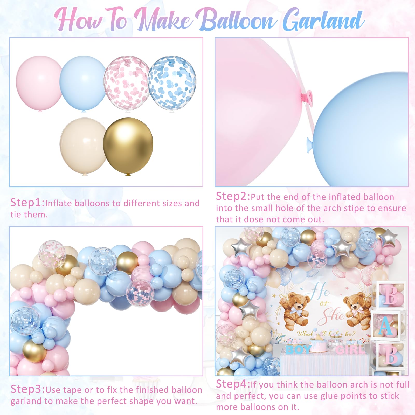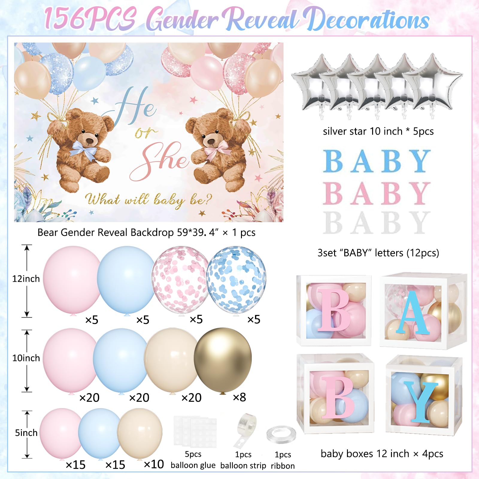 [ Gender Reveal Decoraitons ] - Our gender reveal baby balloon boxes decorations includes 4pcs baby boxes, 3 sets of "Baby" letters, 1pcs baby bear gender reveal backdrop, 5pcs 10" silver star foil balloons, 20pcs 12" balloons(5 pink,5 blue,5 pink confetti,5 blue confetti), 68pcs 10" balloons(20 pink,20 blue,20 nude,8 gold metallic), 40pcs 5" balloons(15 pink,15 blue,15 nude)and balloon tools. The rich decoration set is sure to you enjoy this exciting baby gender reveal party with your family.