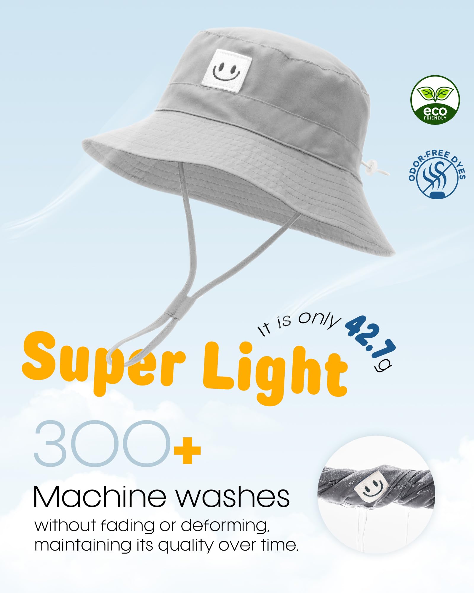 Adjustable size: 0-6M;6-24M;2-5T;this bucket hat grows with your baby ;The elastic adjustment buckle at the back of the toddler bucket hat can easily adjust the head circumference, which is suitable for most babies' head circumference; The chin strap design of the baby summer hat, even your baby can easily adjust to a comfortable position;
