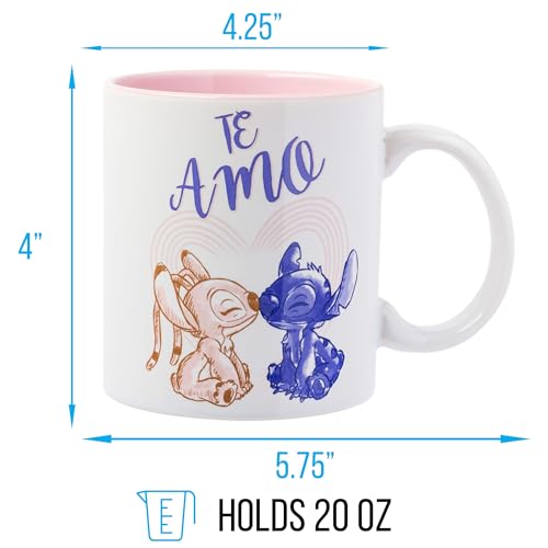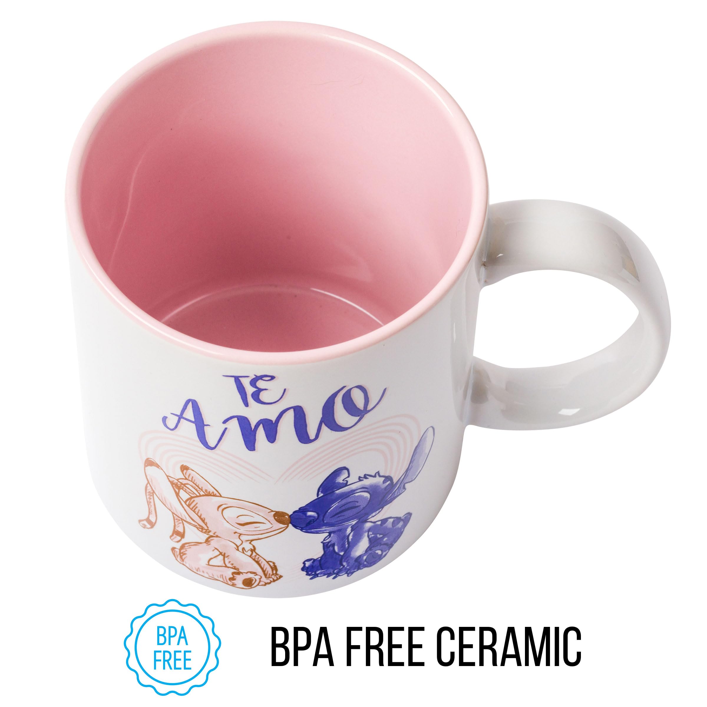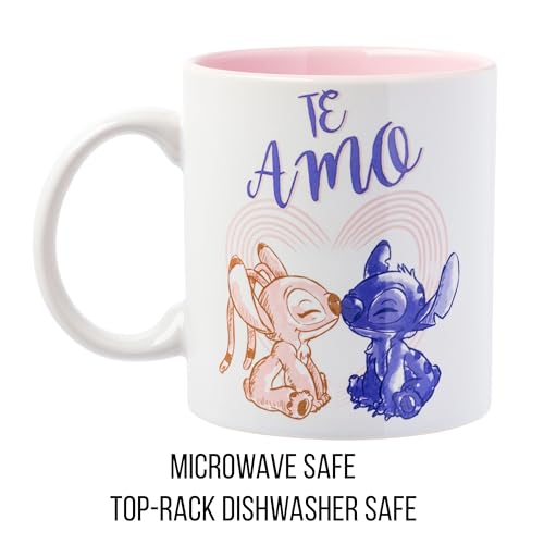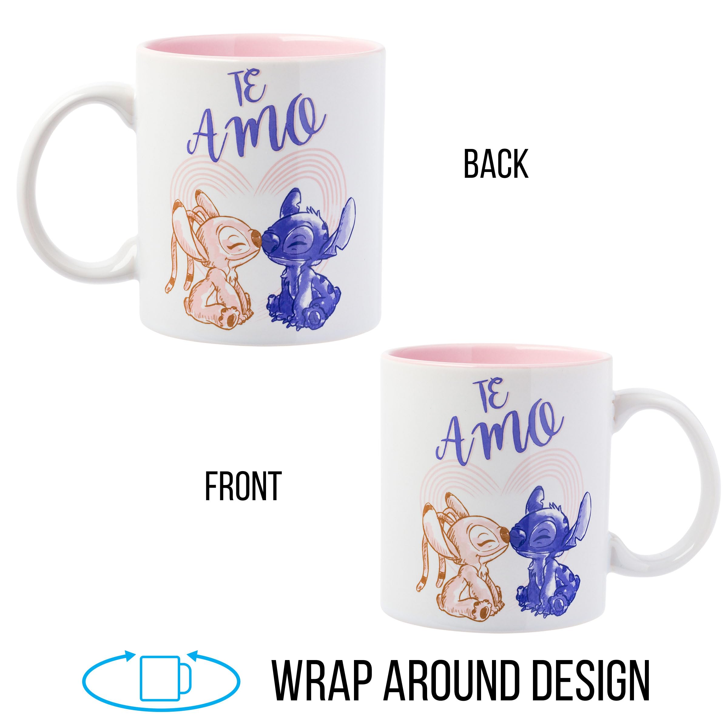 CERAMIC MUG: Enjoy your coffee or tea in this adorable Lilo and Stitch Ceramic Mug 20oz. Te Amo Ceramic Mug. Featuring Stitch and Angel sharing a kiss with the words "Te Amo" above them