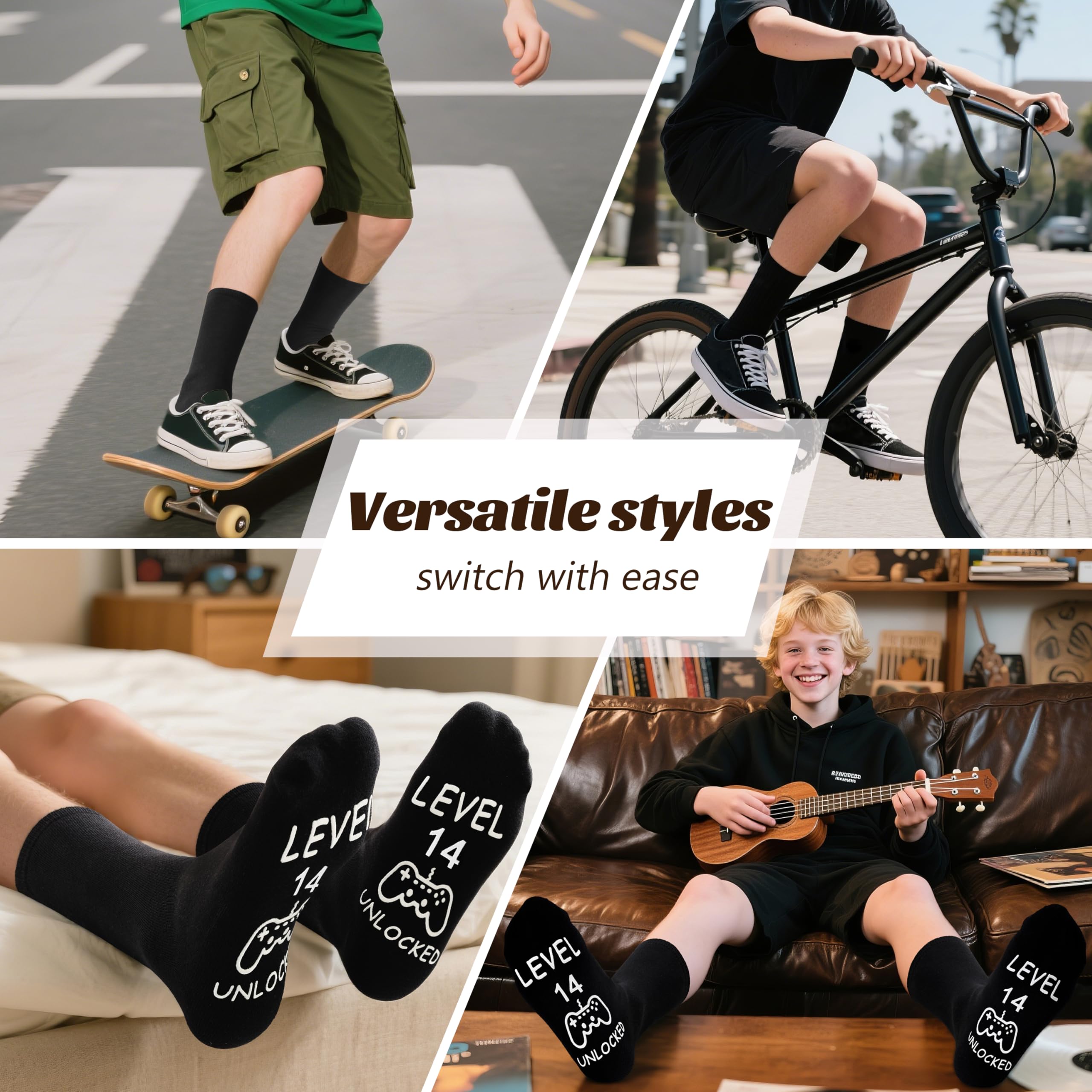 Funny Design: “OFFICIALLY A TEENAGE. LEVEL 14 UNLOCKED” with game-pad printed on these black crew socks. Put on these fun socks, your boys would have a great day.