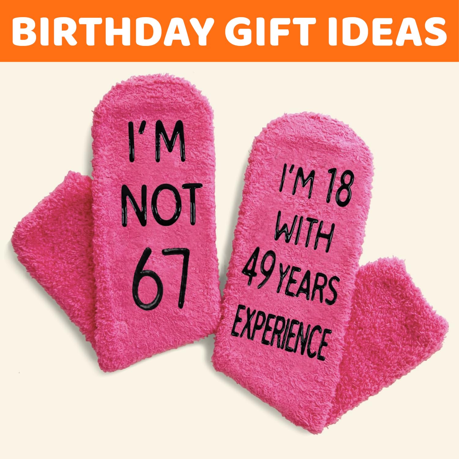 GIFTS FOR WOMEN IN THEIR 67: Say it with socks - "I'M NOT 67, I'M 18 WITH 49 YEARS EXPERIENCE." These are suitable for any holiday gifts, such as Birthday gifts, White Elephant gifts, Christmas gifts, Mother's Day gifts.