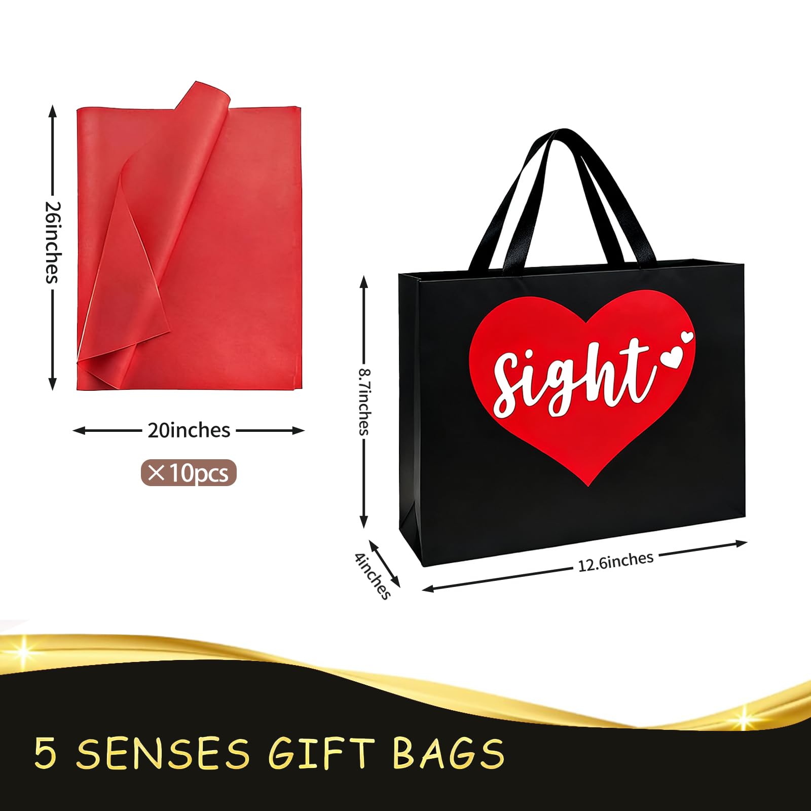 Size details: each sense gift bags measures 12.6 x 8.7 x 4 inches while accompanying tissue papers measure 19.7 x 26 inches, designed to accommodate uniquely shaped gifts, these 5 senses gift bags will help you create the great set of presents, and to show your love and add the last touch to your present
