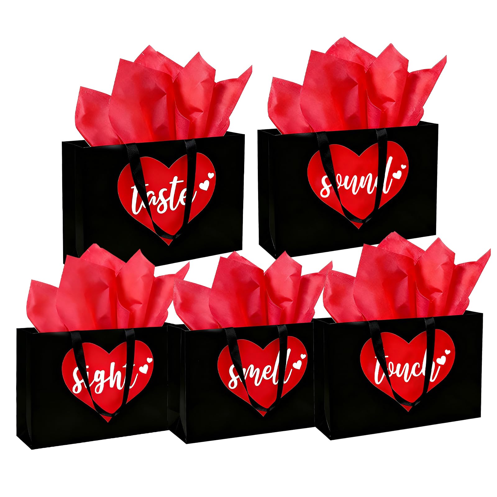 5 Senses Gift Bags Five Senses Gift Bags with Tissue Paper for Anniversary, Valentine's Day, Birthday Five Senses Gift Bags for Him Husband Boyfriend Features: These 5 senses gift bags add a unique and personal touch to your presents, allowing you to convey your sentiments through each of the five senses. Whether you're celebrating a birthday, anniversary, or any special occasion, these bags are the perfect way to show how much you care Specification: Material: thick cardboard paper Color: as the picture shown Quantity: 5 Pieces in total Package Content: 5 x gift bags NOTE: Please allow 1 - 2 mm error due to the hand measurement