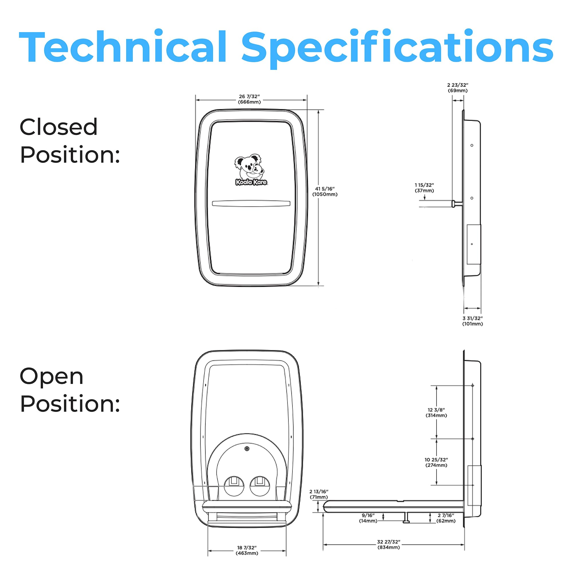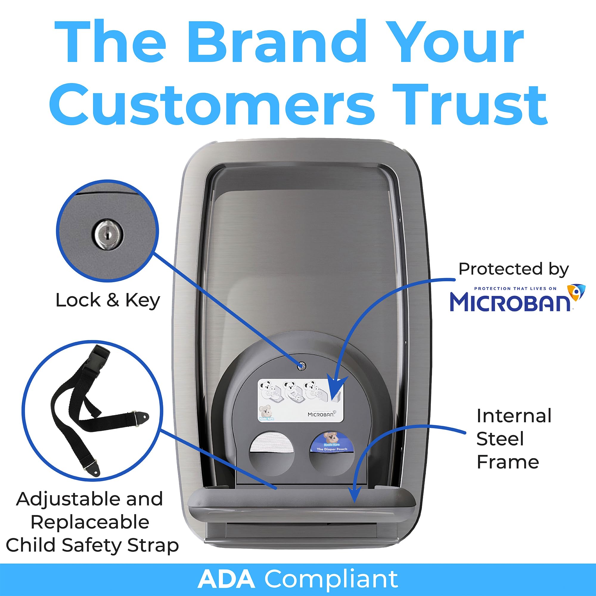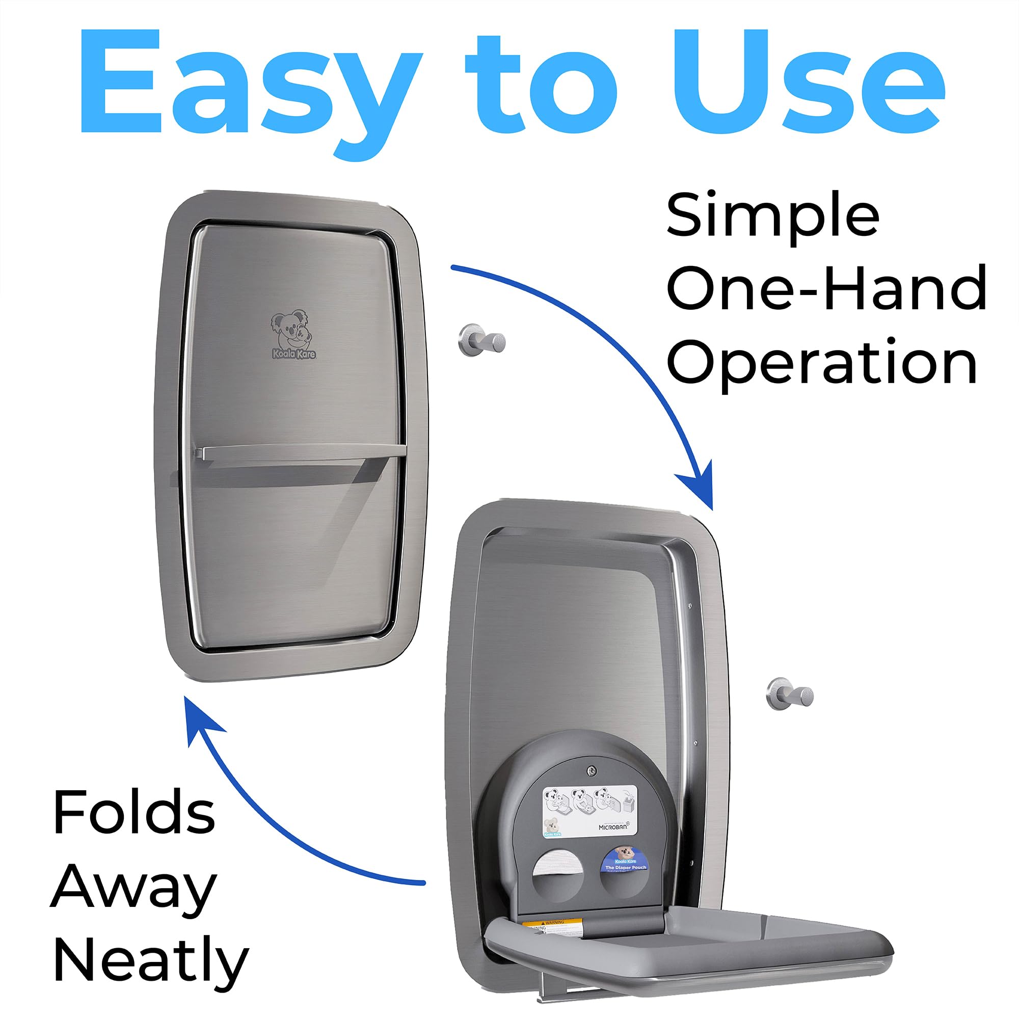 Introducing the Koala Kare KB311, a pinnacle of form and function for modern washrooms. This recessed-mounted, vertical baby changing station boasts a seamless stainless-steel exterior, creating a sleek, sophisticated look. Designed without seams, sharp edges, or weld lines, it not only upgrades your space but ensures safety and comfort. The KB311 is fully ADA and ASTM-compliant, making it an inclusive solution for all families. It features a laser-etched logo that reflects quality and reliability. The innovative dual-cavity dispenser is engineered for efficiency, seamlessly providing sanitary bed liners and diaper disposal bags. Adding to the convenience is a stainless-steel bag hook, thoughtfully positioned for easy access to diaper bags, enhancing the user experience. The changing station's bed surface, treated with Microban protection, actively reduces odor-causing bacteria, maintaining a cleaner environment between washroom cleanings. Meets ADA requirements when installed properly. Choose the Koala Kare KB311 for a harmonious blend of aesthetics, safety, and functionality, making every visit a pleasant experience for parents and children.
