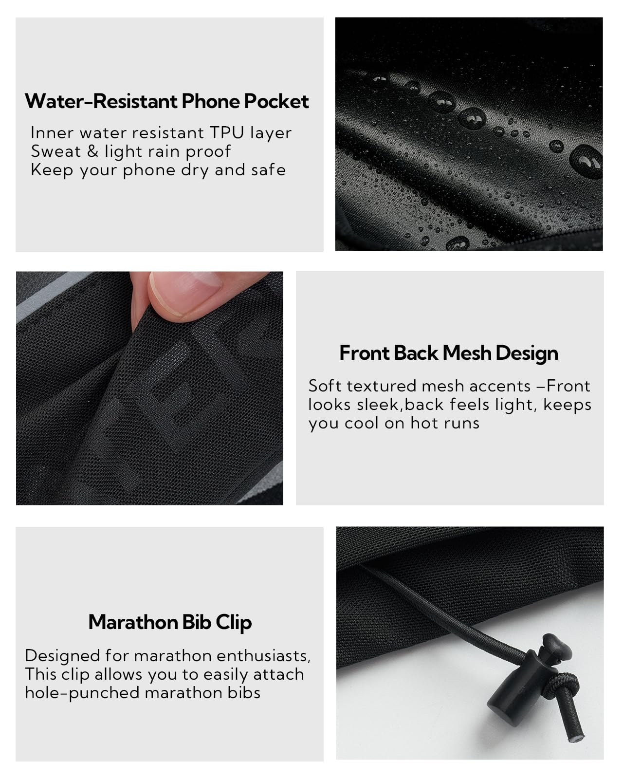 Multiple Pockets for Easy Organization: With 3 pockets, this running bag helps you store items orderly. Water resistant phone pocket fits phones up to 7". Two side zippered mesh pockets securely hold earphones, energy gels, tissues, and keys. Never lose your essentials again!