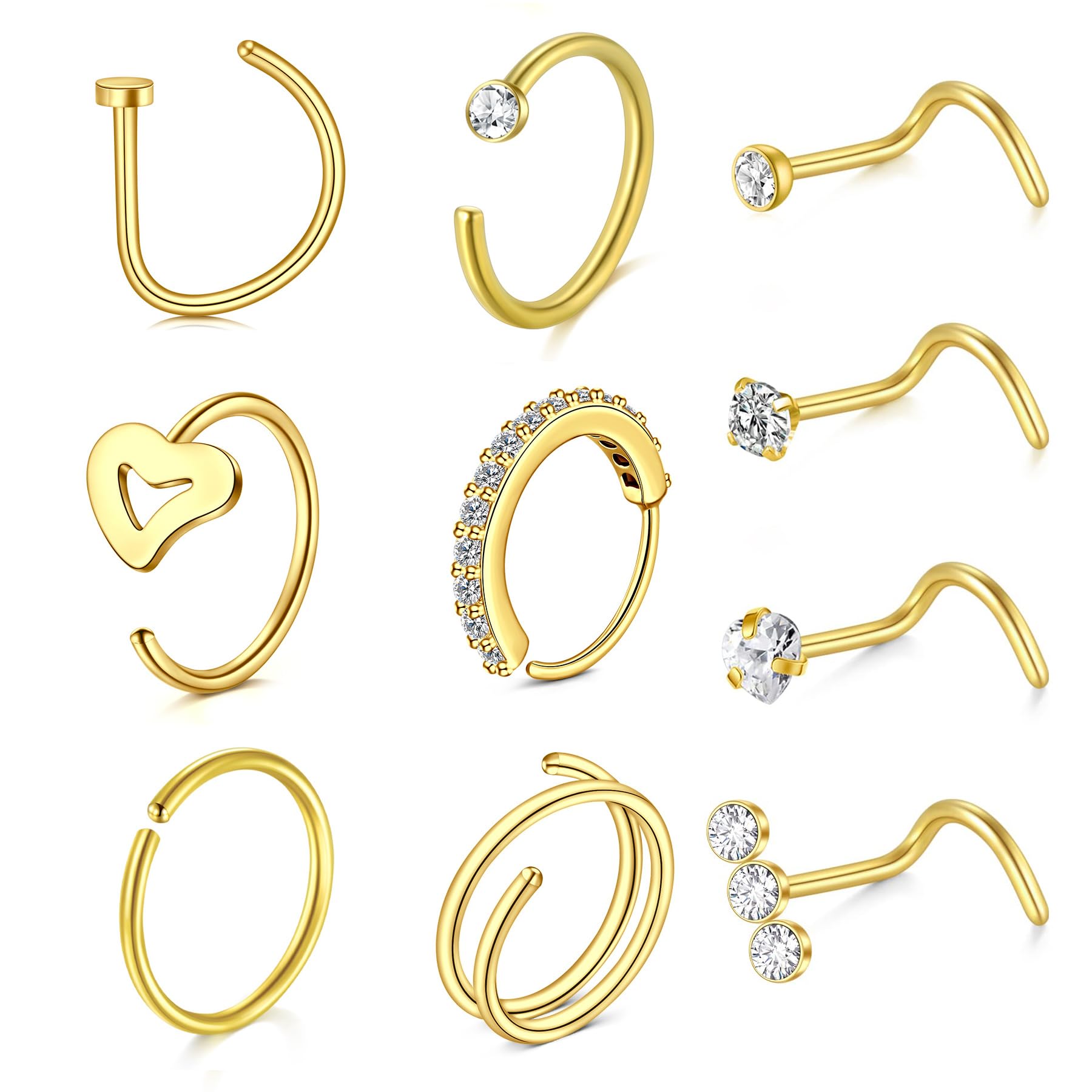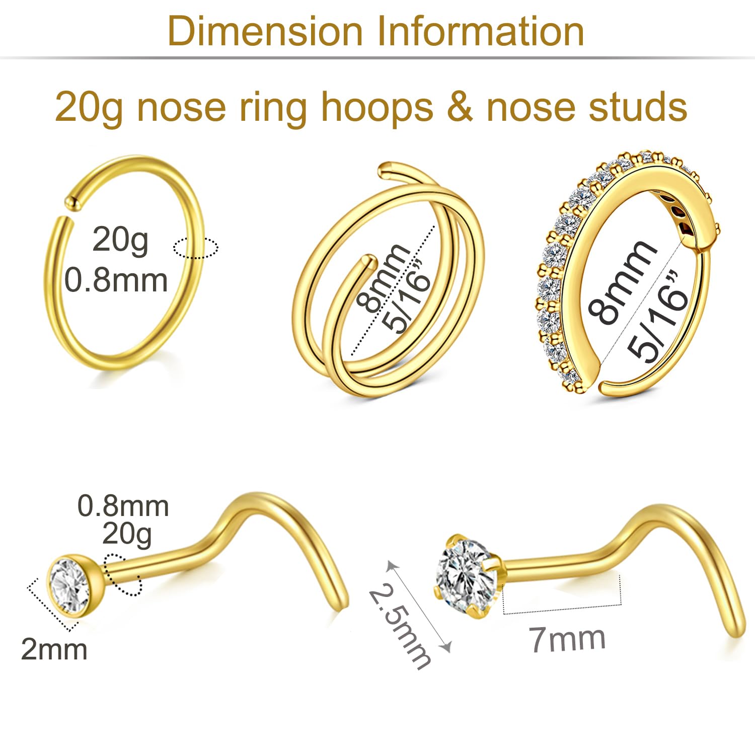 Measurements- gold nose rings hoops 20gauge (0.8mm), nose hoops inner diameter: 5/16"(8mm); Nose studs 20 gauge (0.8mm), nose rings studs pole length: 7mm; corkscrew nose ring top size: 2mm, 2.5mm;