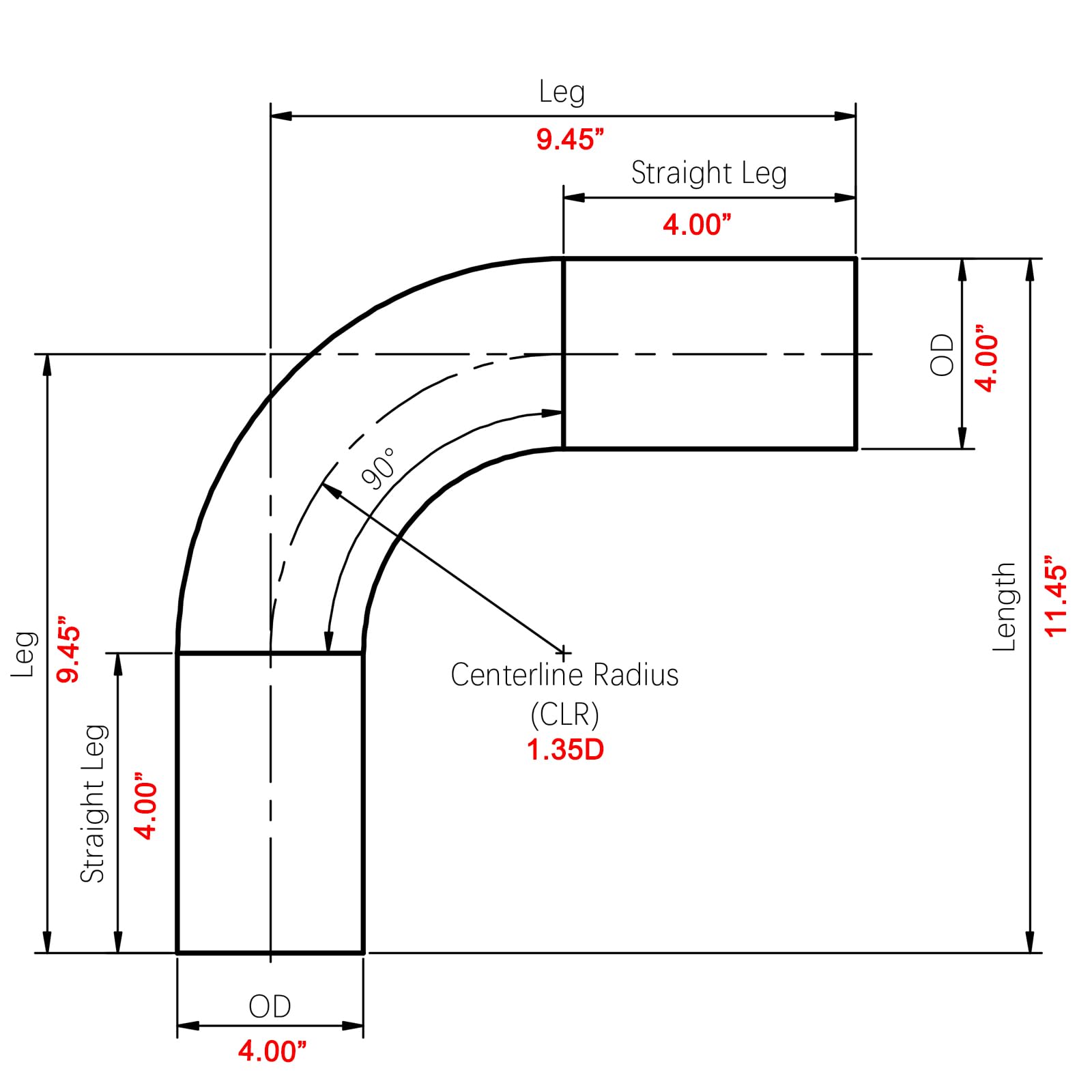 90 Degree bend, outside diameter: 4" (102mm), Leg Length: 4" (100mm), wall thickness: 0.078" (2mm), Tight Radius